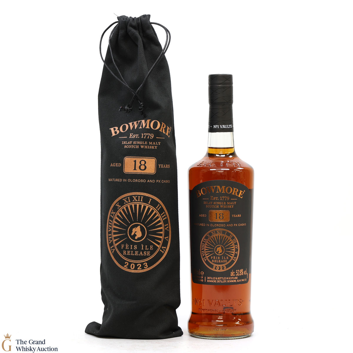 This is the Feis Ile 2023 release from Bowmore Distillery. Matured in Oloroso & PX casks for 18 years, this single malt was bottled at 52.8% ABV. This rare annual release from Bowmore is limited to just 3500 bottles.