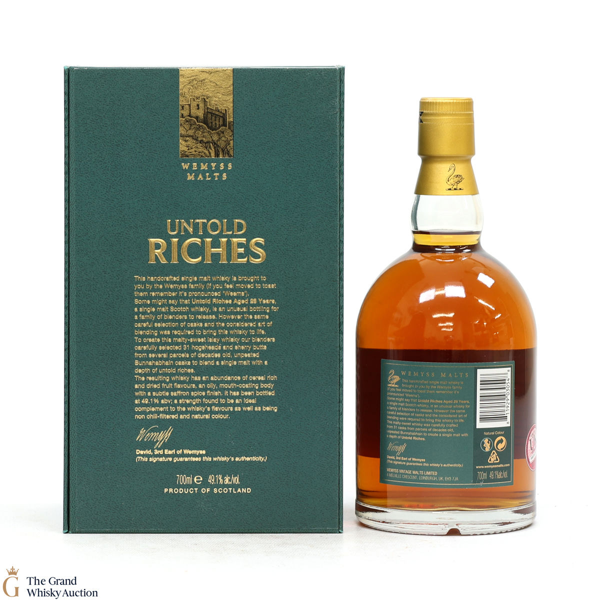 This handcrafted single malt is brought to you by the Wemyss family. Distilled at Bunnahabhain distillery, the Untold Riches 28-Year-Old is a single malt held in hogsheads and sherry butts from several parcels of decades-old, unpeated Bunnahabhain casks.