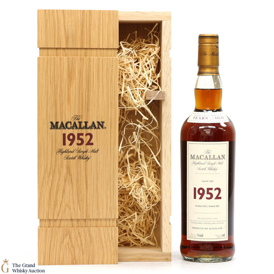 This is a beautiful bottle of 1952 vintage Macallan. It was distilled in 1952 and aged in single Sherry cask #1250, for an impressive 49 years, before being bottled in 2002 at 48% ABV. This bottle is an impressive vintage release from The Macallan Fine & Rare series. It comes with an intelligent wooden presentation case.