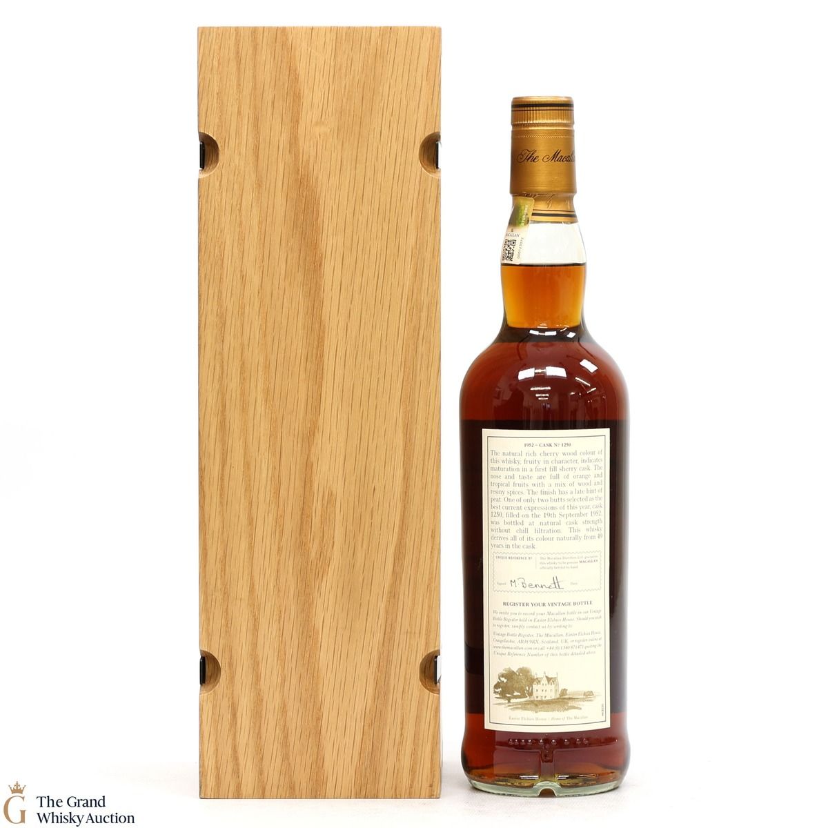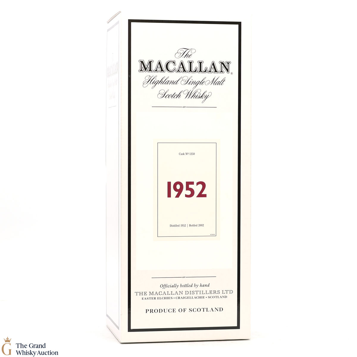 This is a beautiful bottle of 1952 vintage Macallan. It was distilled in 1952 and aged in single Sherry cask #1250, for an impressive 49 years, before being bottled in 2002 at 48% ABV. This bottle is an impressive vintage release from The Macallan Fine & Rare series. It comes with an intelligent wooden presentation case.