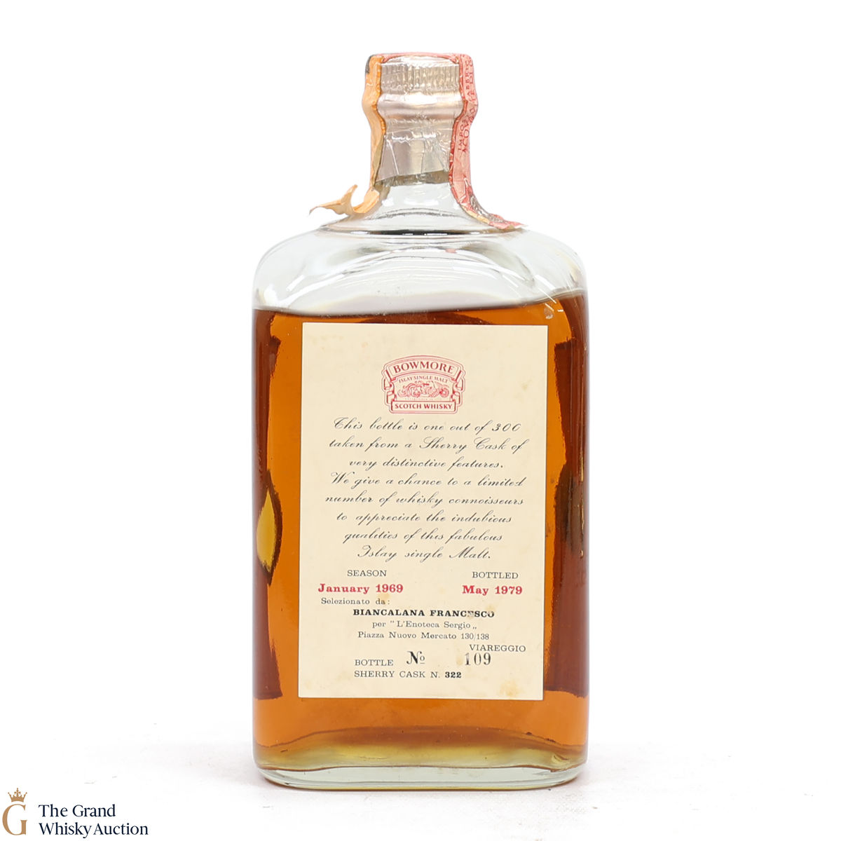 This 1969 vintage was released exclusively to Itlay in 1979 to celebrate Bowmore's 200th birthday. It matured in sherry cask #322 for 10 years prior to being bottled at cask strength.