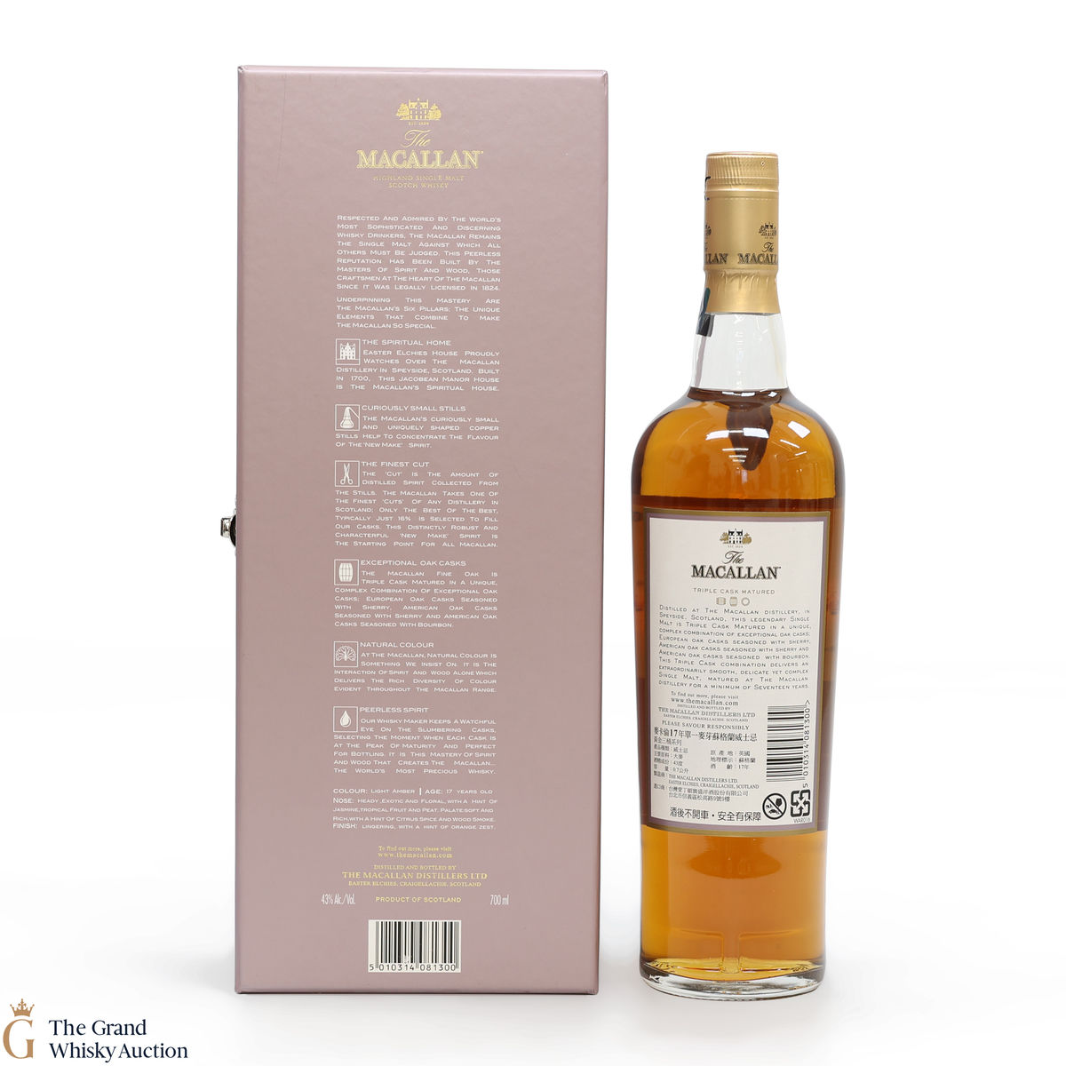 The Macallan Fine Oak 17 Years Old is part of the Macallan Fine Oak range. It has been matured for a minimum of seventeen years in three oak cask types including American and European ex-oloroso sherry and American oak bourbon casks. It was introduced to the US market in 2006.
