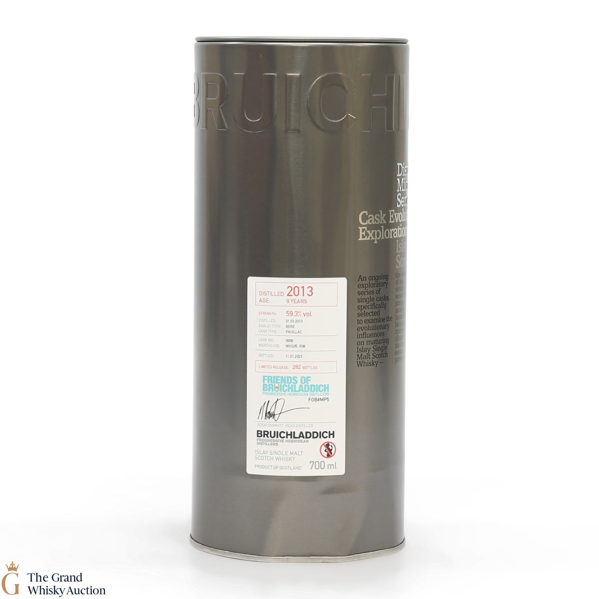 This single malt was distilled using Bere barley in 2013 and matured in a Pauillac cask #0958 for 9 years in warehouse WHS05 R08. It was then bottled at 59.3% ABV in 2023, one of just 282 bottles produced for the Friends of Bruichladdich.