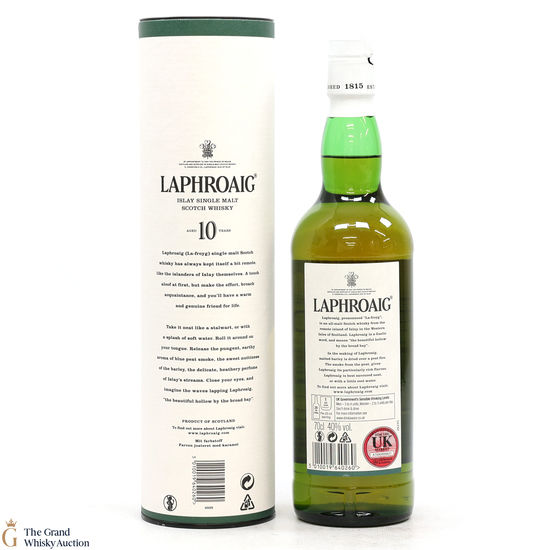 A 70cl of the medicinal 10-year-old from Islay's bestselling distillery, Laphroaig. In making Laphroaig, malted barley is dried over a peat fire. The smoke from this peat, found only on Islay, gives Laphroaig its particularly rich flavour.