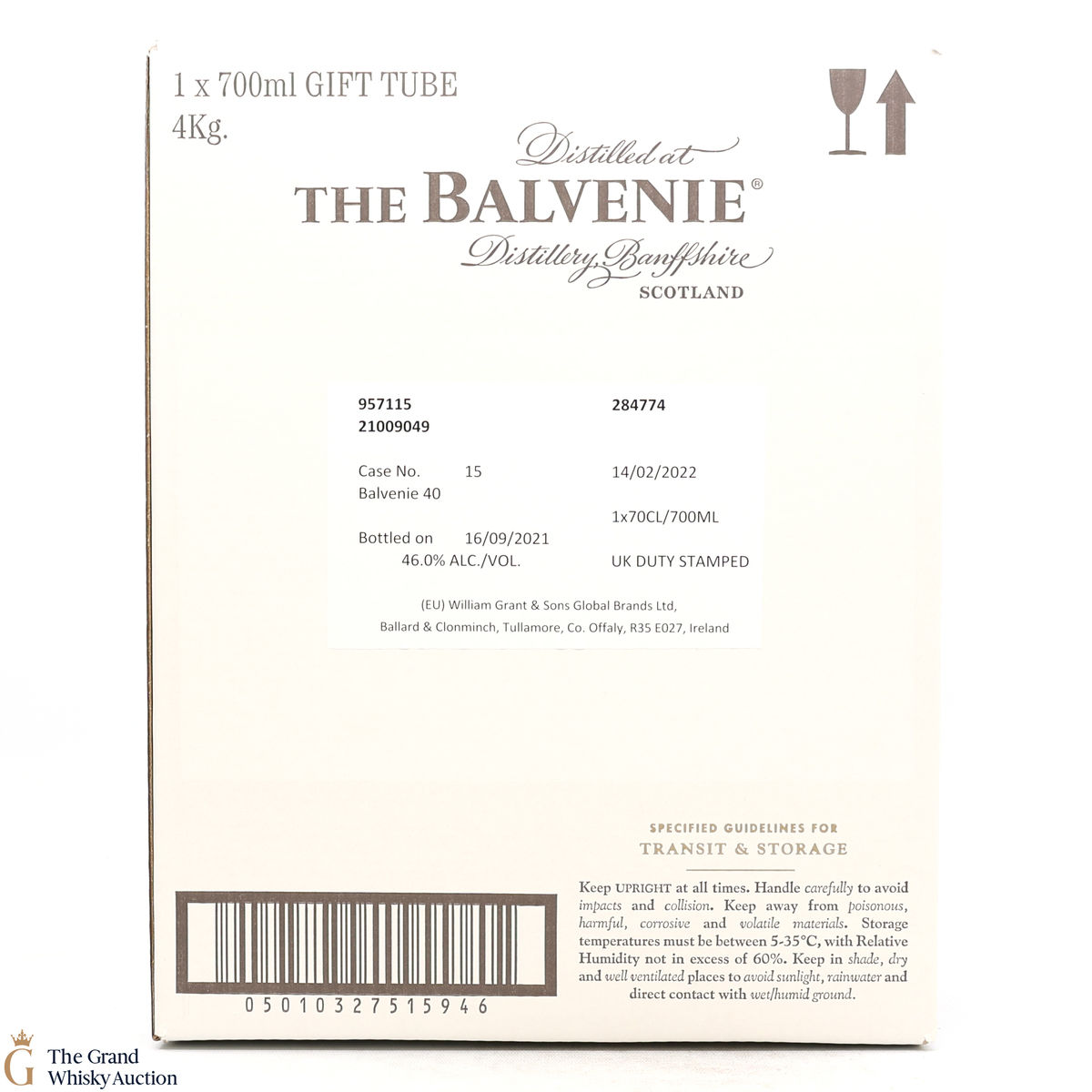 Due to the various ages of bottles and their seals, the condition of liquid is at the buyer's discretion and no claim can be lodged against failure/leakage in transit. Loss and breakage cover is available at 3% of the hammer price as standard. If the lot is not insured, no claim can be lodged against the courier or The Grand Whisky Auction for breakage or loss in transit.