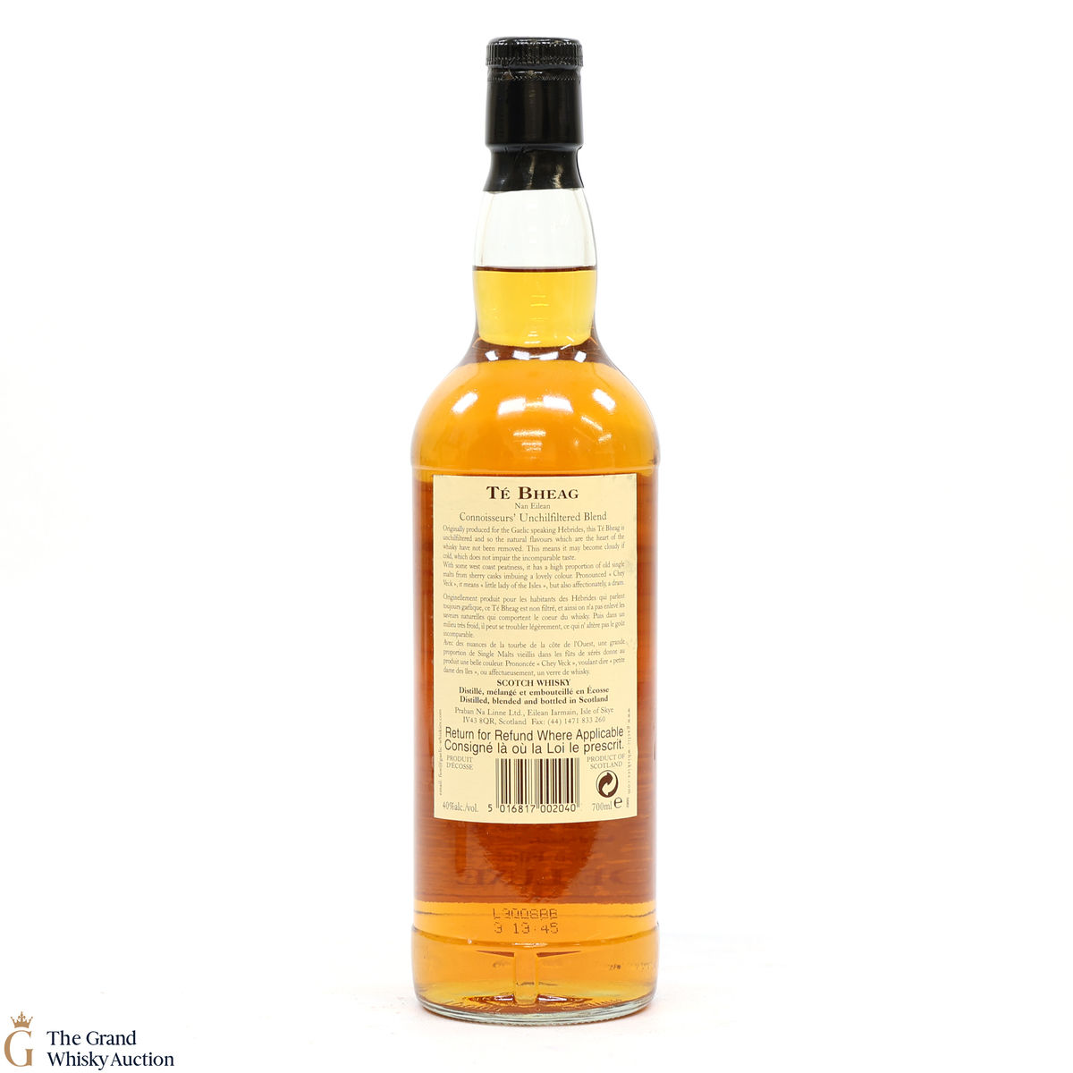 Due to the various ages of bottles and their seals, the condition of liquid is at the buyer's discretion and no claim can be lodged against failure/leakage in transit. Loss and breakage cover is available at 3% of the hammer price as standard. If the lot is not insured, no claim can be lodged against the courier or The Grand Whisky Auction for breakage or loss in transit.