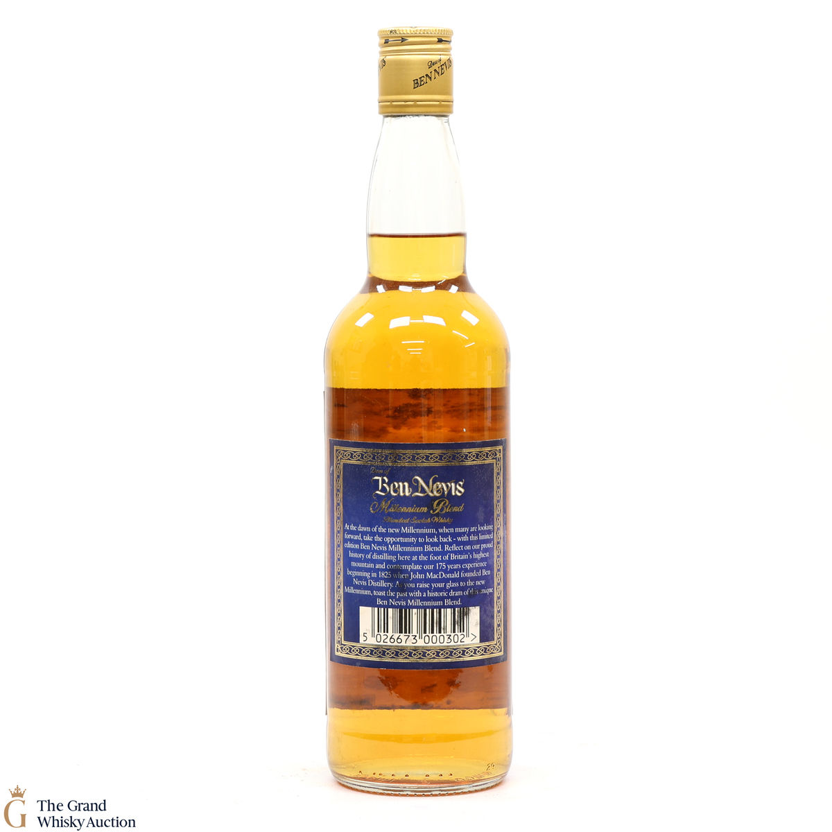 A bottle of Dew of Ben Nevis Millenium Blend blended Scotch whisky, produced by Ben Nevis Distillery Limited to celebrate the new millennium.