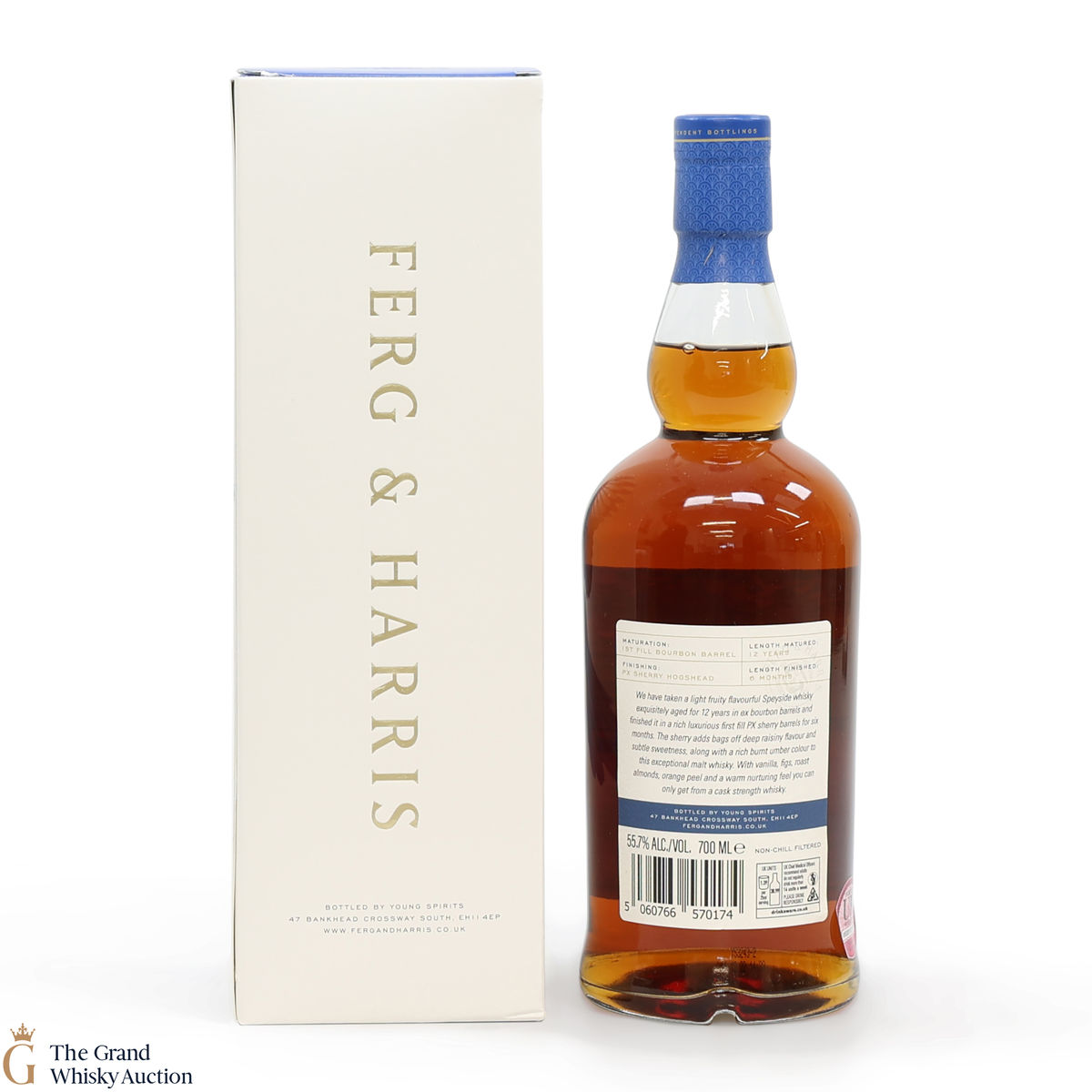 This Speyside single malt was matured for 12 years in first-fill bourbon barrels before being finished for six months in Pedro Ximenez sherry casks. 2,873 bottles were bottled at 55.7% ABV by independent bottlers Ferg & Harris.