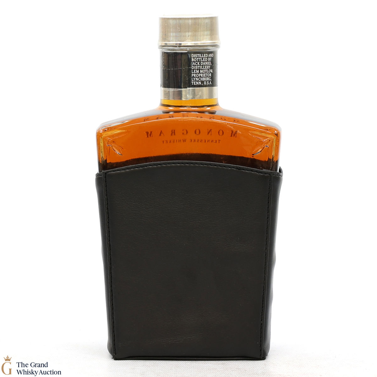 An unusually-shaped bottling of Jack Daniel's Monogram in a leather holder. This bottling was redesigned in 2004 for the Asian Market.