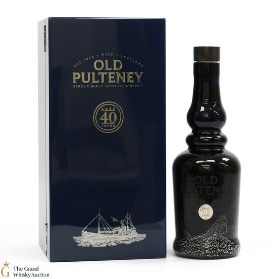This is a very handsome 40-year-old from Old Pulteney indeed. This single malt was drawn from 3 sherry casks and a single bourbon barrel, that were all filled in 1968. The bottle is hand-blown and decorated with silver waves blown across the glass while the metal was molten. It is capped with a polished stone stopper and it comes in a striking presentation case.