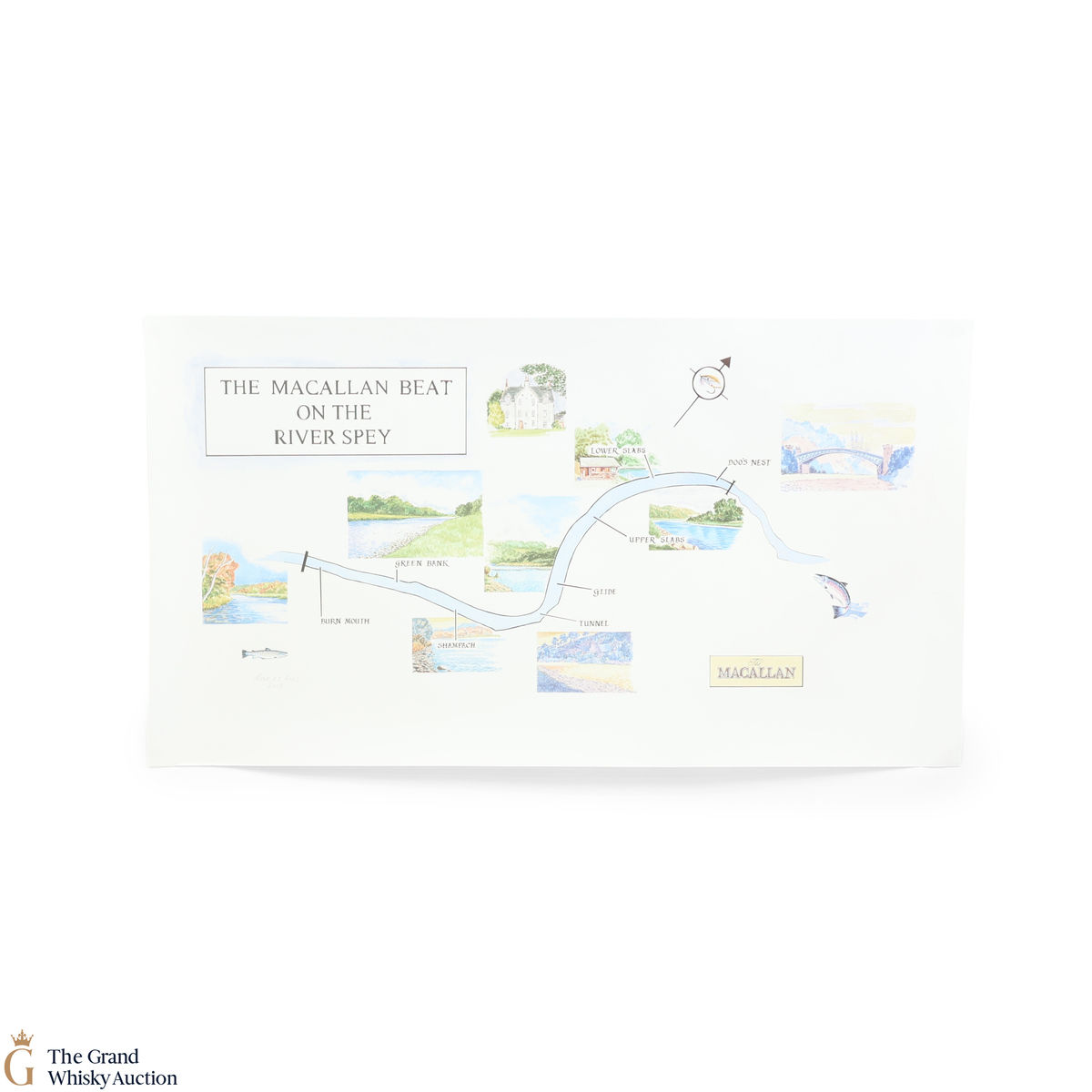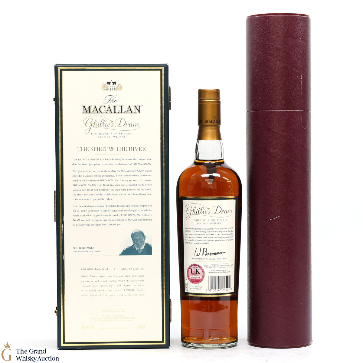 This unique lot is a limited edition Ghillie's Dram from Macallan. Dedicated to the Ghillie Willie Bremner, who operates in the River Spey. Included with this bottle of 12 Year Old single malt is two fly fishing hooks and a watercolour of the River Spey.