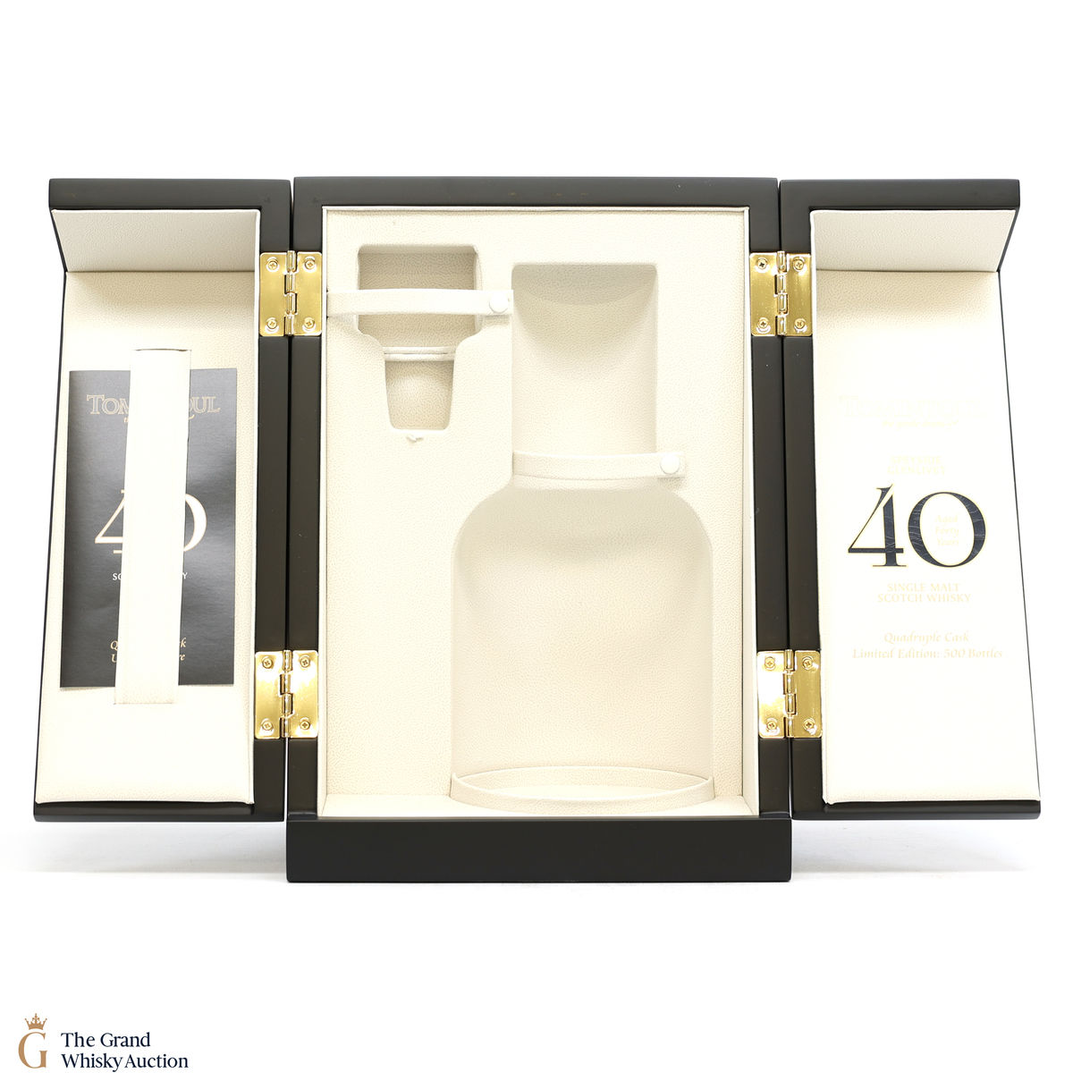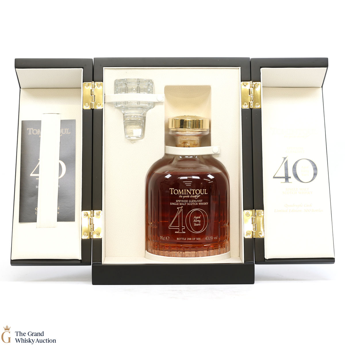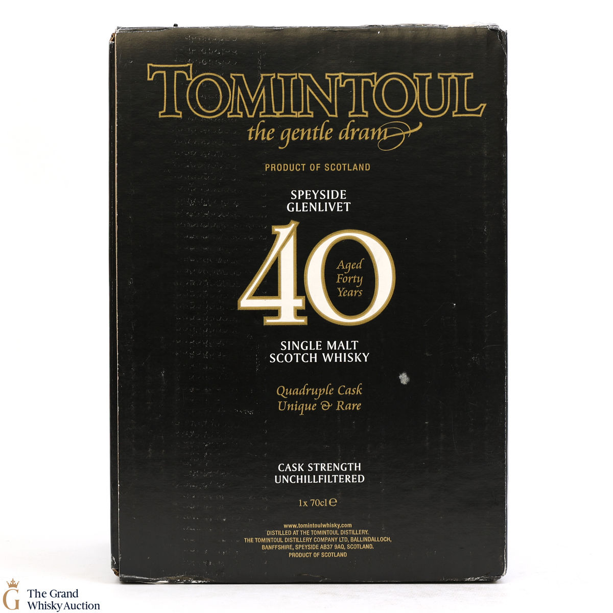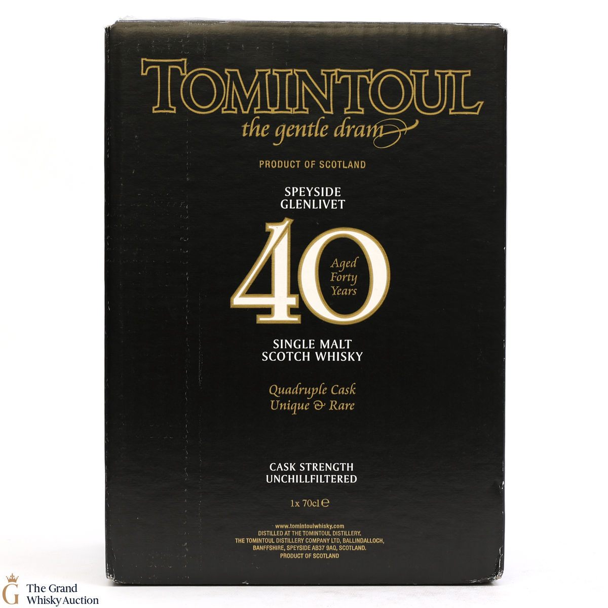 This is a 40-year-old single malt from the Tomintoul Distillery, a unique and rare bottling of quadruple-cask matured whisky.