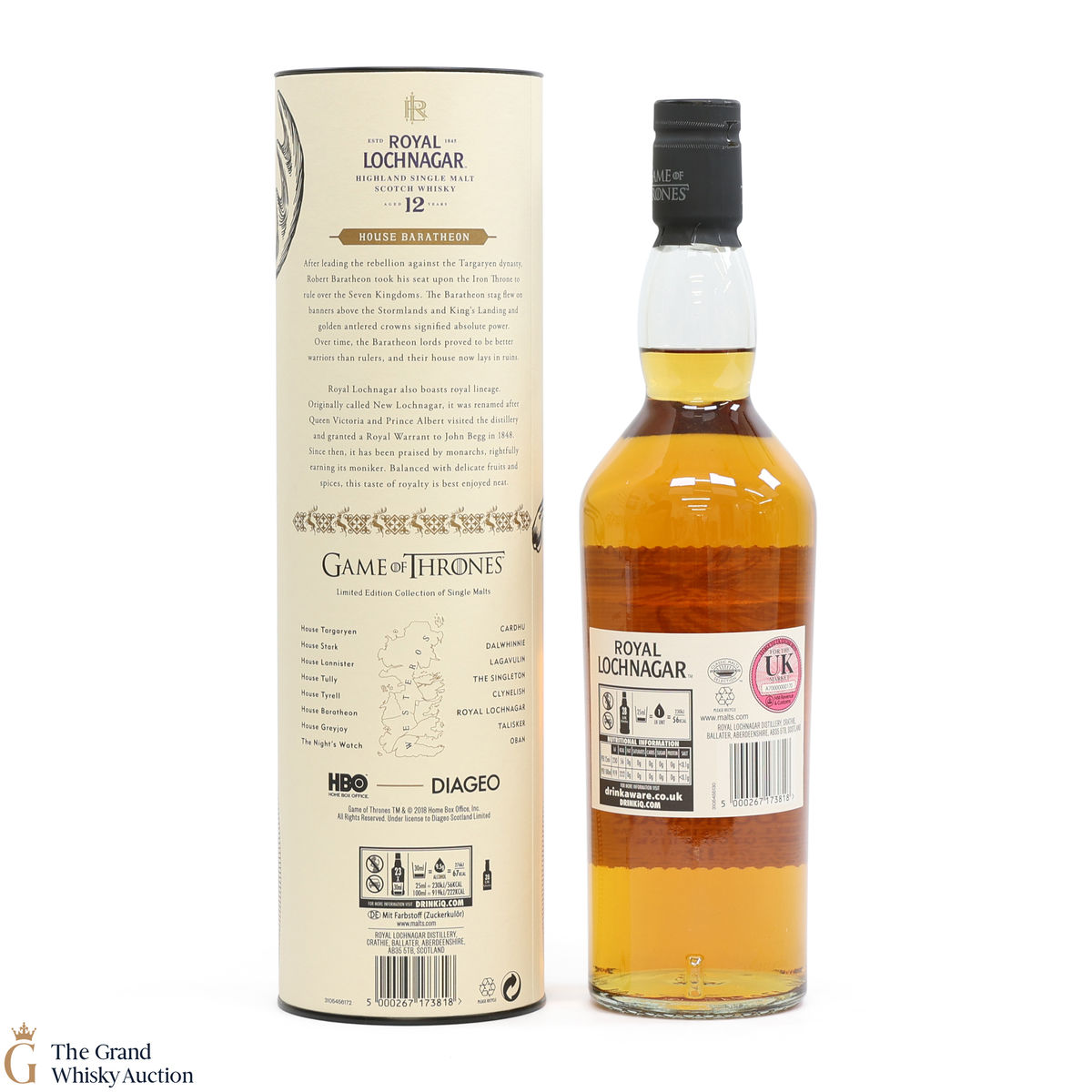 This is a limited-edition 12 year old single malt from Royal Lochnagar and it is part of Diagio's 2018 collaboration with HBO. Each single malt in the series relates to the land of houses of the Game of Thrones television series. The Royal Lochnagar bottle is decorated with a rampant black Stag, the sigil of House Baratheon that once flew on banners above the Stormlands and King’s Landing signifying absolute power.