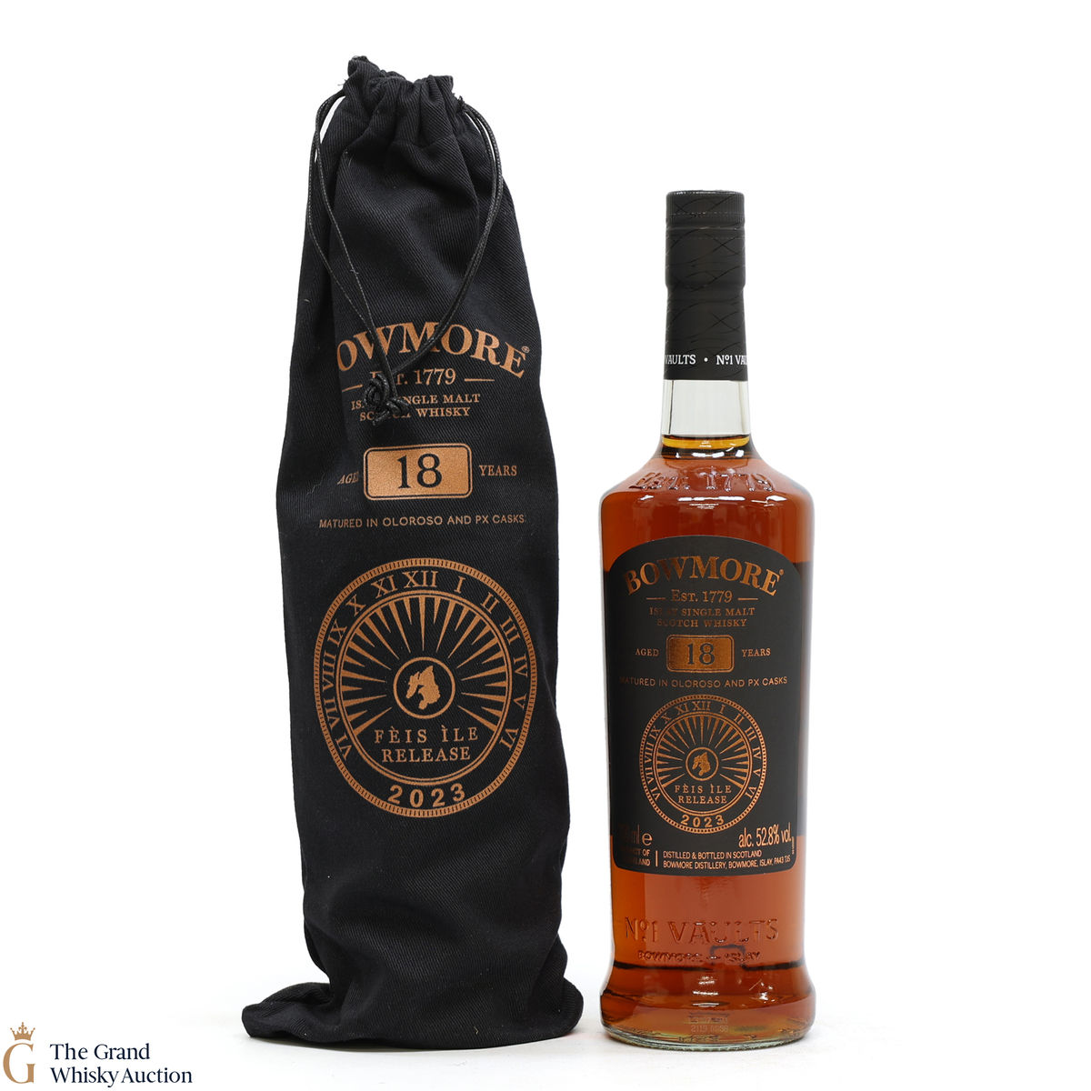 This is the Feis Ile 2023 release from Bowmore Distillery. Matured in Oloroso & PX casks for 18 years, this single malt was bottled at 52.8% ABV. This rare annual release from Bowmore is limited to just 3500 bottles.