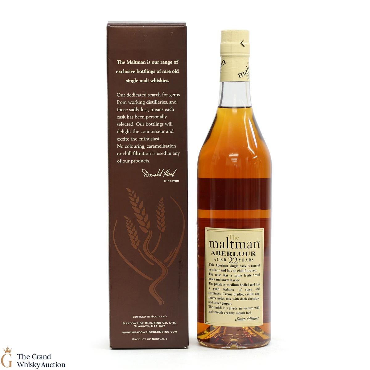 Due to the various ages of bottles and their seals, the condition of liquid is at the buyer's discretion and no claim can be lodged against failure/leakage in transit. Loss and breakage cover is available at 3% of the hammer price as standard. If the lot is not insured, no claim can be lodged against the courier or The Grand Whisky Auction for breakage or loss in transit.