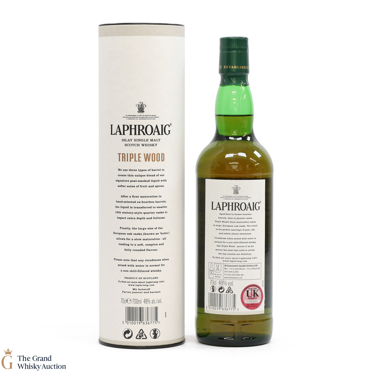 This is a 70 cl bottling of Laphroaig Triple wood. It was originally launched for the duty-free market but the Triple Wood has become a core expression from Laphroaig. The single malt has been triple matured; in bourbon barrels, quarter casks and then Oloroso sherry butts.