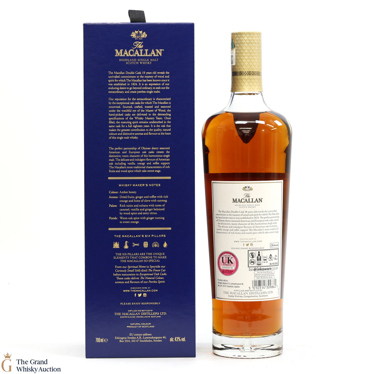 This 18-year-old Macallan was matured in a combination of American and European Sherry oak for a minimum of 18 years. It is part of the Macallan Double Cask range, which marries the classic Macallan style and the sweetness of American oak.