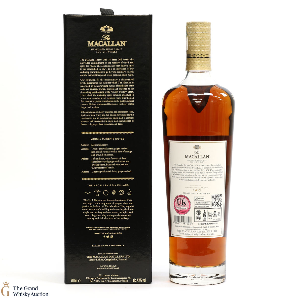 This annual release of The Macallan's popular 18-year-old Sherry Oak is matured exclusively in sherry-seasoned casks, built from both Spanish and American oak, providing a beautifully dark flavour with rich aromas.