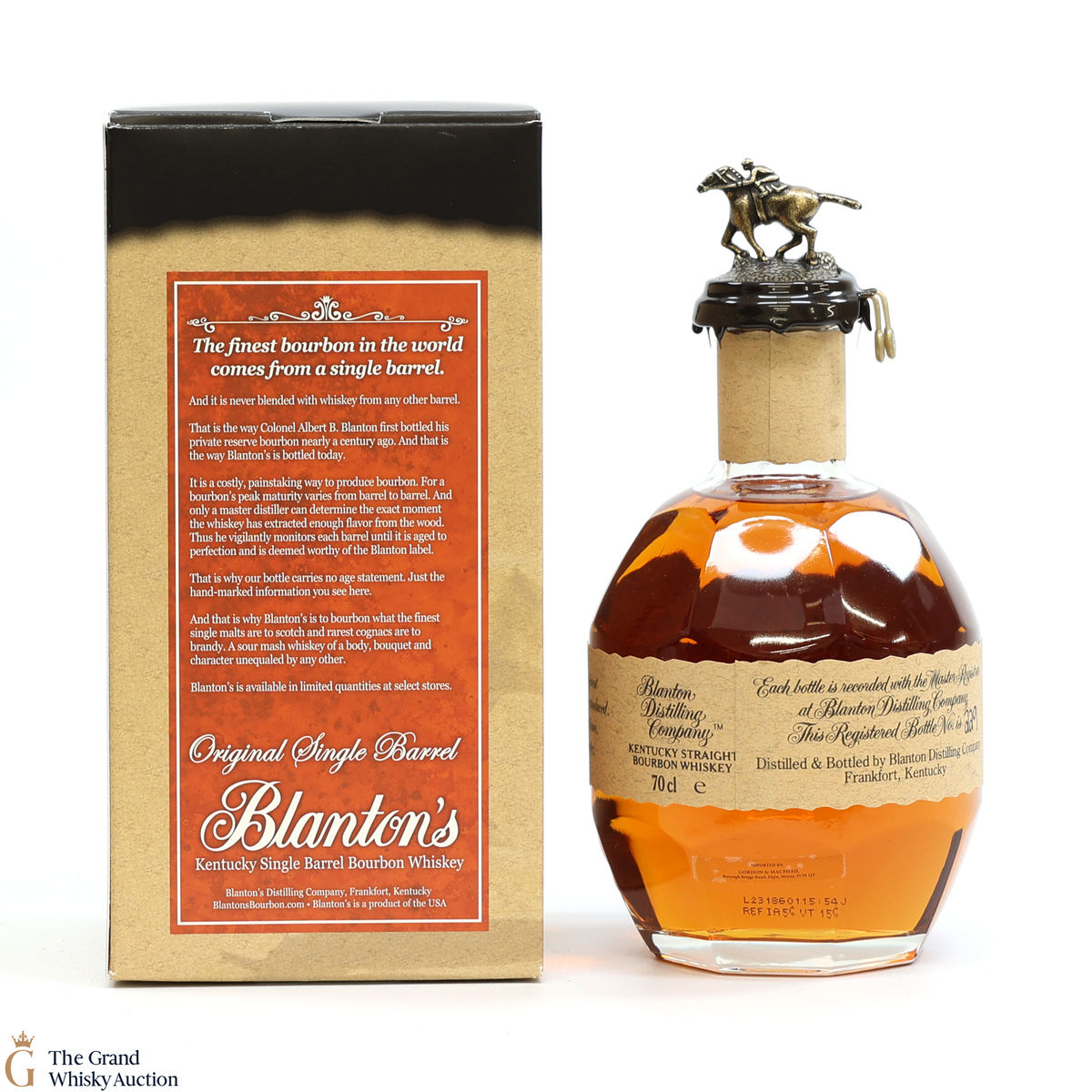PLEASE NOTE: The wax seal on Blanton's bottles are prone to cracking in transit due to their design. Therefore, as stated in our T&C’s, we do not and will not accept liability should the seal be breached, broken, split or leak in transit. Additionally, please know due to the design of the internal cardboard packaging that surrounds the top of the bottles, it too may be torn. By bidding on this lot you have understood this to be true. Insurance is for complete breakage or loss in transit only.