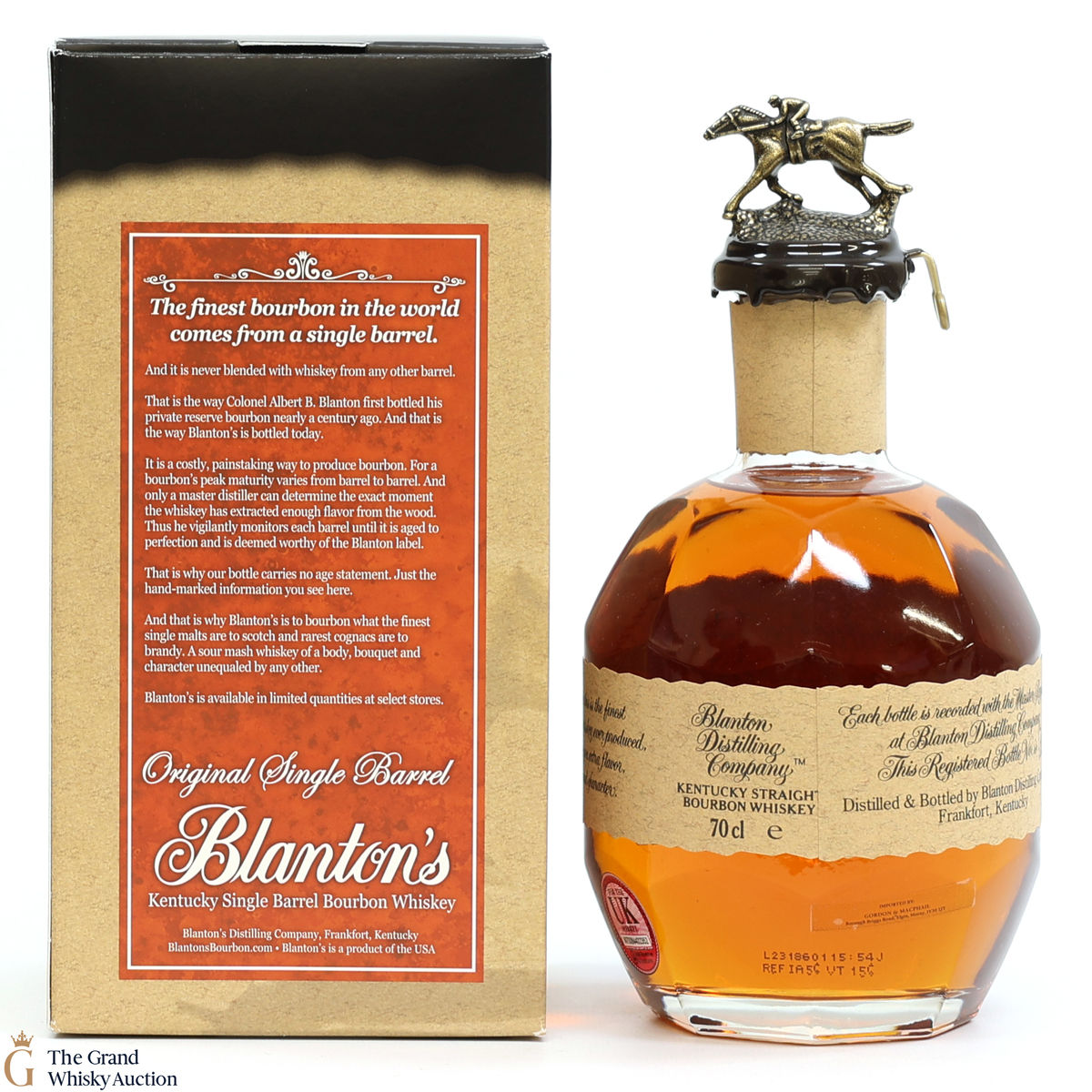 PLEASE NOTE: The wax seal on Blanton's bottles are prone to cracking in transit due to their design. Therefore, as stated in our T&C’s, we do not and will not accept liability should the seal be breached, broken, split or leak in transit. Additionally, please know due to the design of the internal cardboard packaging that surrounds the top of the bottles, it too may be torn. By bidding on this lot you have understood this to be true. Insurance is for complete breakage or loss in transit only.