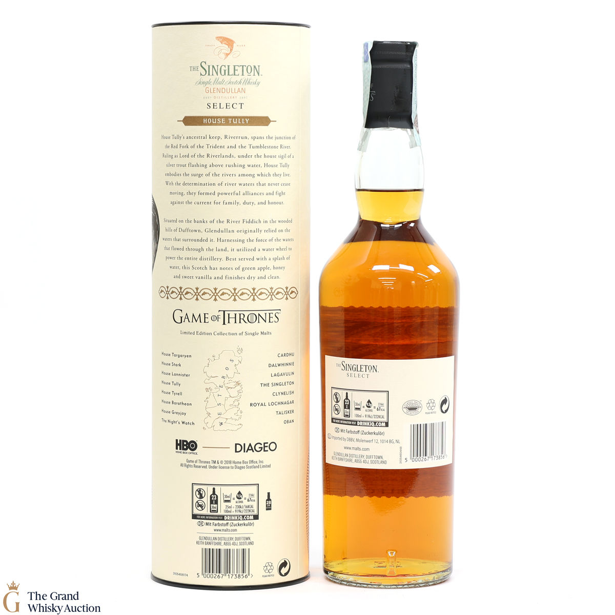 The Singleton Glendullan Reserve hails from Dufftown distillery. Glendullan is located on the banks of the River Fiddich, so it has been cleverly paired with House Tully at Riverrun, which is in the region known as The Riverlands. This single malt Scotch whisky is decorated with a jumping trout - the sigil of House Tully.