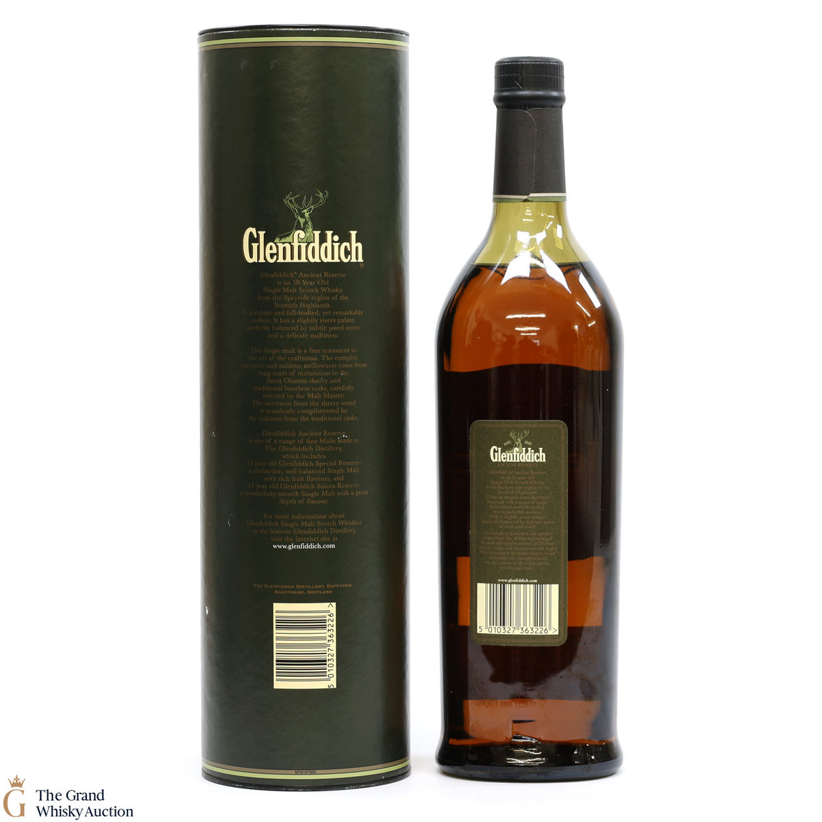 Glenfiddich's 18-year-old Ancient Reserve single malt whisky. This edition comes in the Glenfiddich livery rather than the decanters used in the early 1990s.