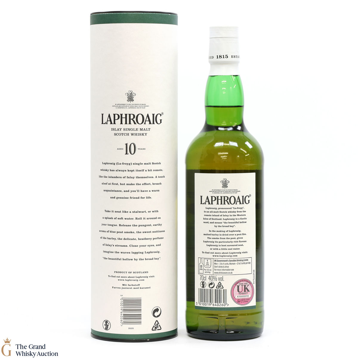 A 70cl of the medicinal 10-year-old from Islay's bestselling distillery, Laphroaig. In making Laphroaig, malted barley is dried over a peat fire. The smoke from this peat, found only on Islay, gives Laphroaig its particularly rich flavour.