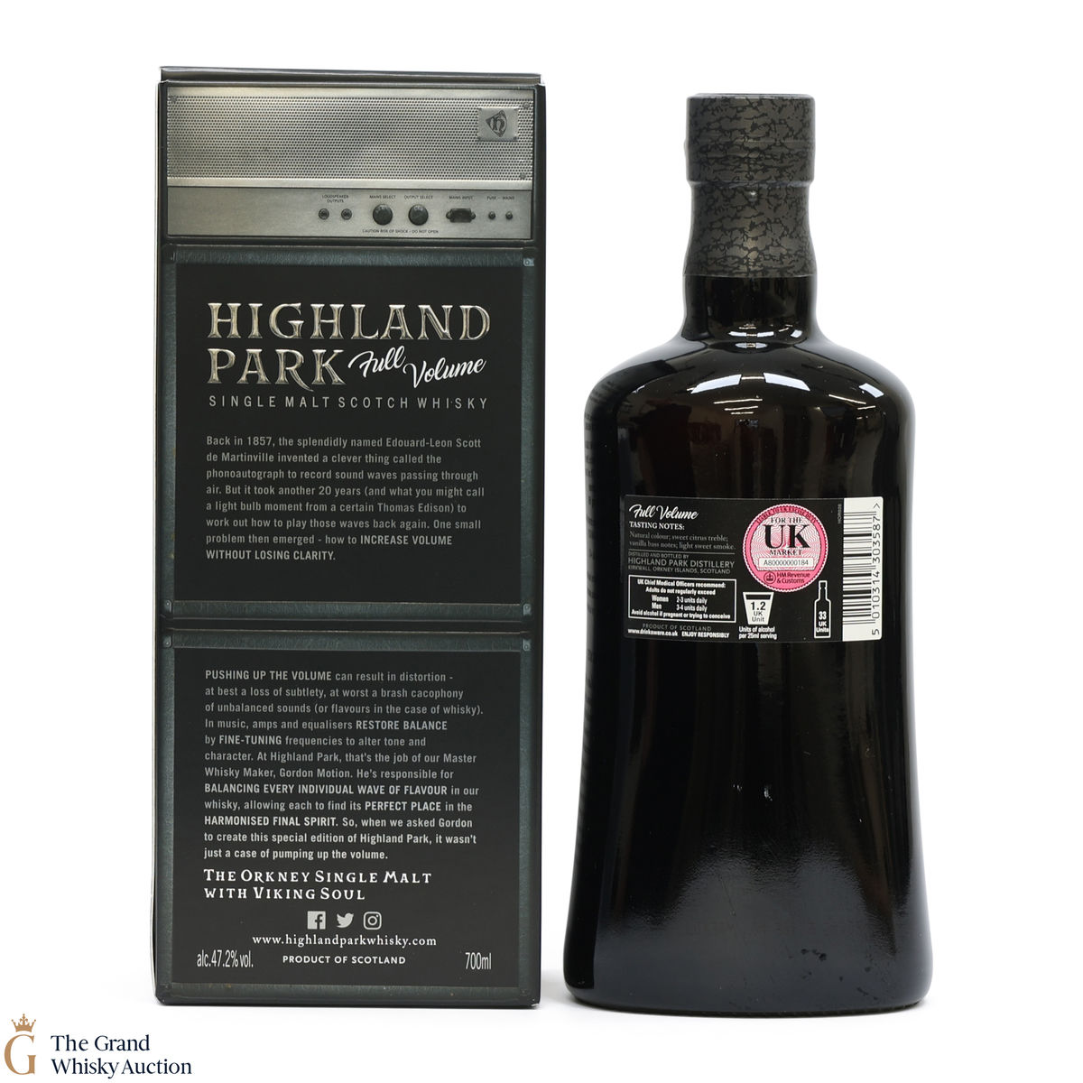 Full Volume by Highland Park was distilled in 1999 and bottled in 2017 from 481 casks. The single malt was matured exclusively in first-fill bourbon casks and was bottled at 47.2% ABV and comes presented in a themed presentation box resembling speaker.