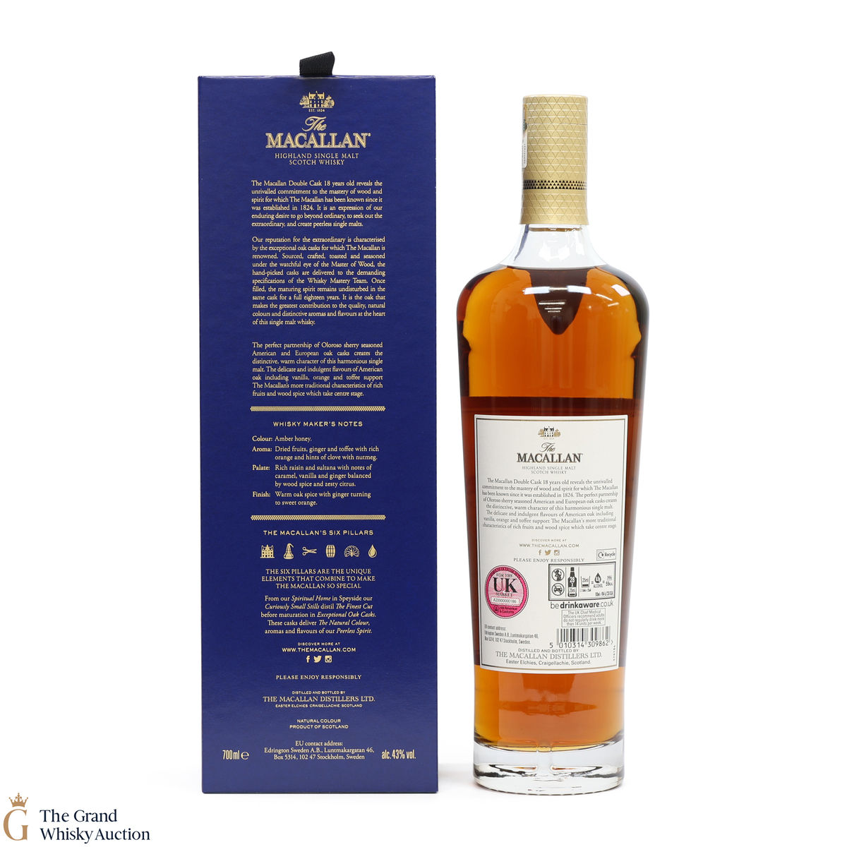 This 18-year-old Macallan was matured in a combination of American and European Sherry oak for a minimum of 18 years. It is part of the Macallan Double Cask range, which marries the classic Macallan style and the sweetness of American oak.