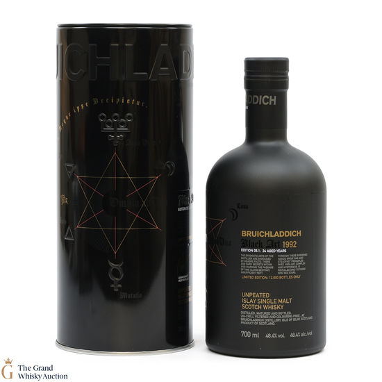 Distilled in 1992 this 5th edition limited release of Black Art Bruichladdich has been bottled as a 24-year-old at 48.4% ABV, after being matured in American and European Oak wines casks. One of 12,000 bottles.