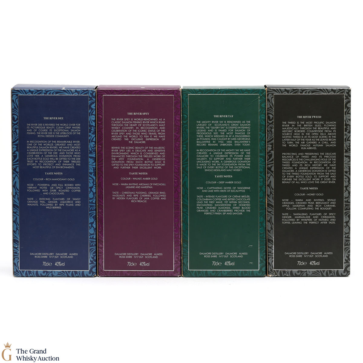 The Dalmore Rivers Collection includes four bottlings named after four famous Scottish Salmon rivers, The Dee, The Spey, The Tweed and The Tay. Each expression was bottled at 40%. This lot includes 4 x 70cl bottlings.
