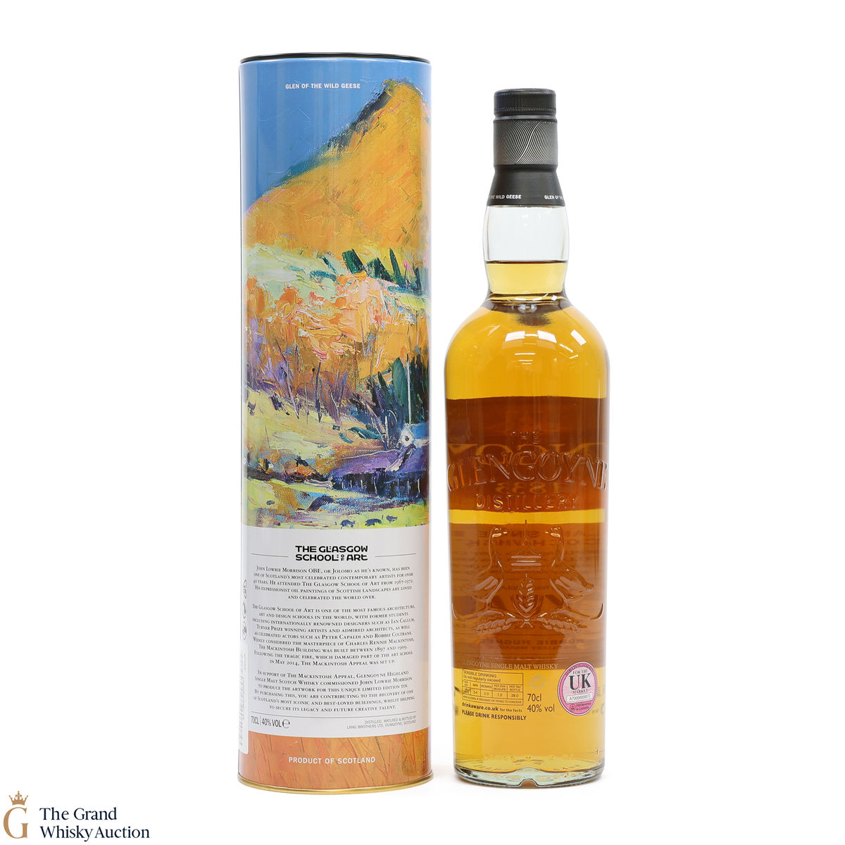 A collectable Glengoyne 10-year-old. This bottling is a special edition in aid of the Glasgow School of Art, Mackintosh Appeal comes with an eye-catching tin, that depicts a painting of Autumn Moon over Glengoyne distillery by John Lowrie Morrison and a Jolomo Print.