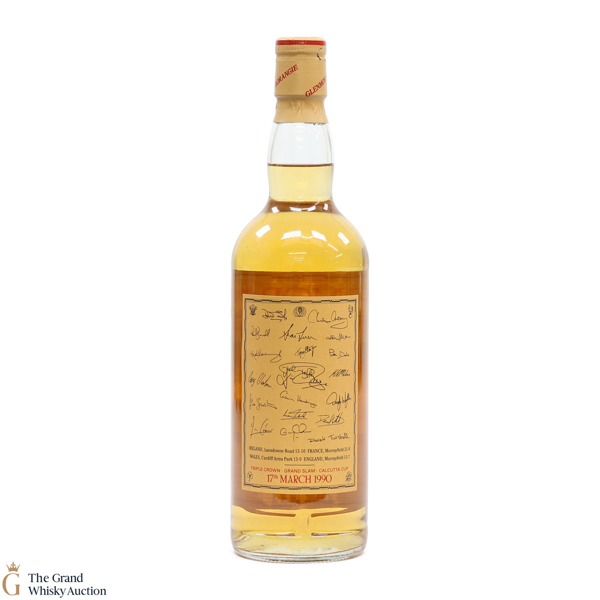 This bottle of Glenmorangie 10-Year-Old was released in celebration of the Scottish Rugby Team's Grand Slam win in 1990 - the victory took place on 17th March 1990 and this is detailed on the neck label.
