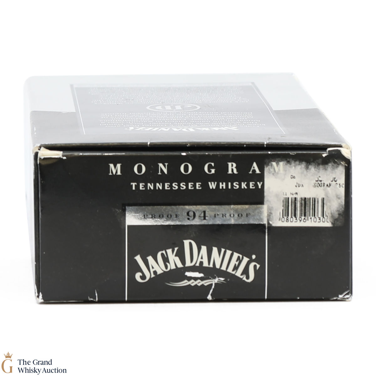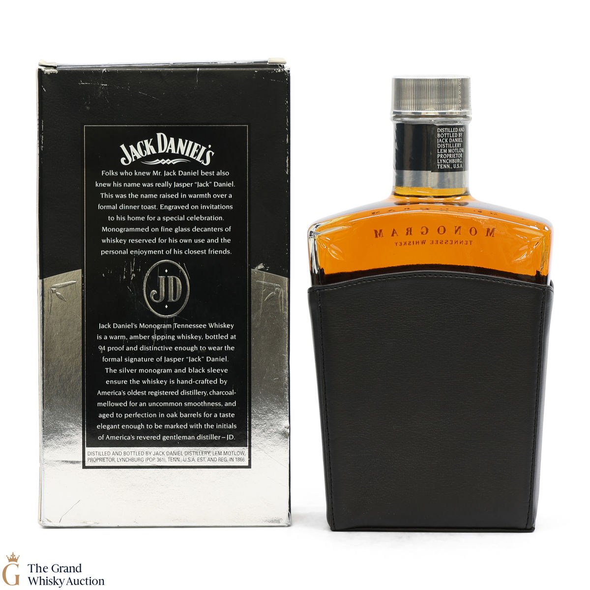 An unusually-shaped bottling of Jack Daniel's Monogram in a leather holder. This bottling was redesigned in 2004 for the Asian Market.