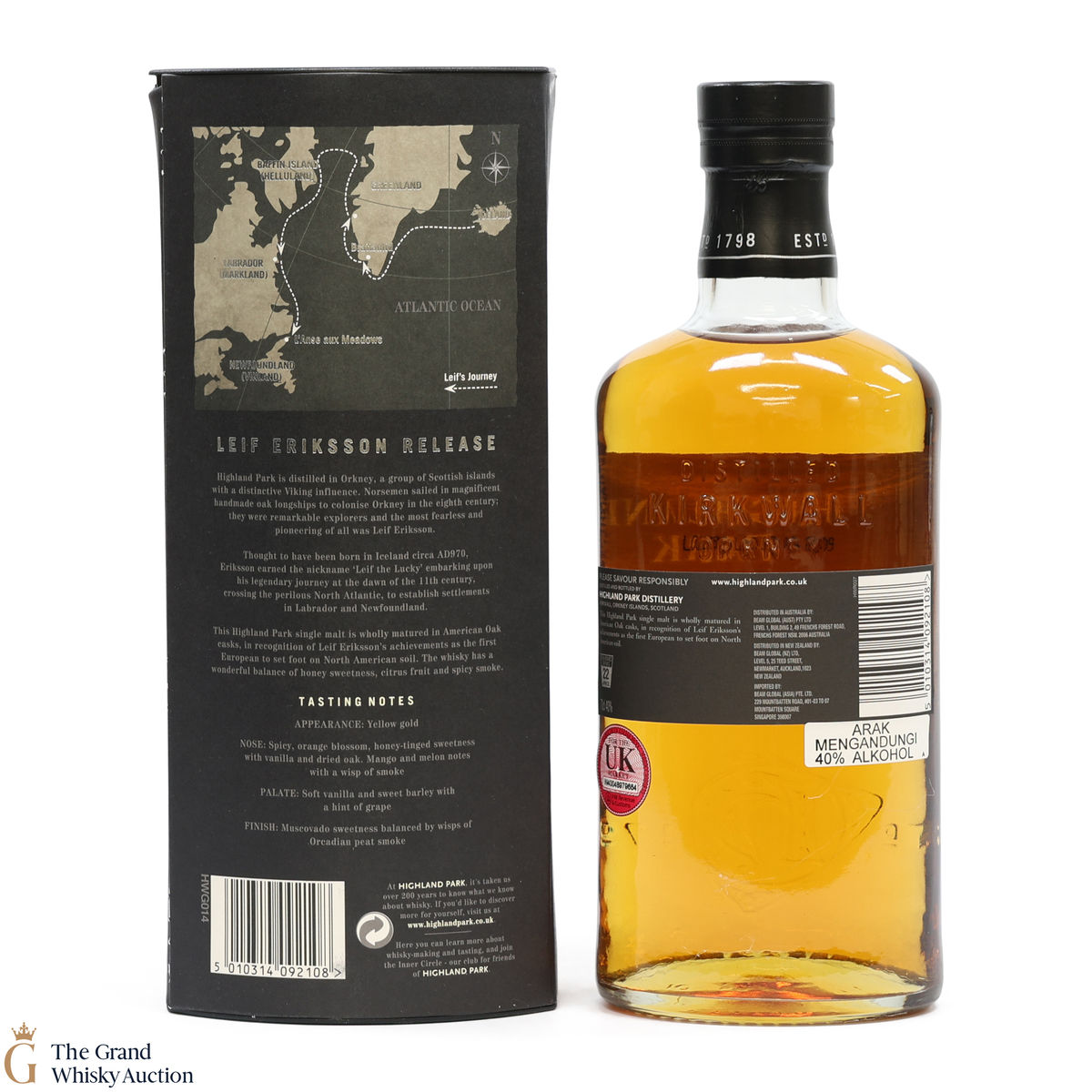 Launched in March 2010, for the travel retail market, Highland Park Leif Eriksson Limited Edition was released to celebrate the first European to reach America over a thousand years ago. The single malt was matured in American oak casks, both ex-bourbon and ex-sherry in recognition of Leif Eriksson, a pioneering Viking explorer, as the first European man to set foot on American soil.