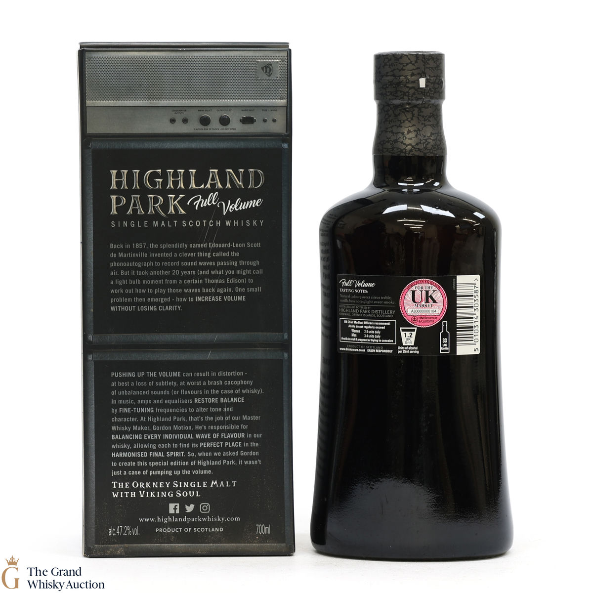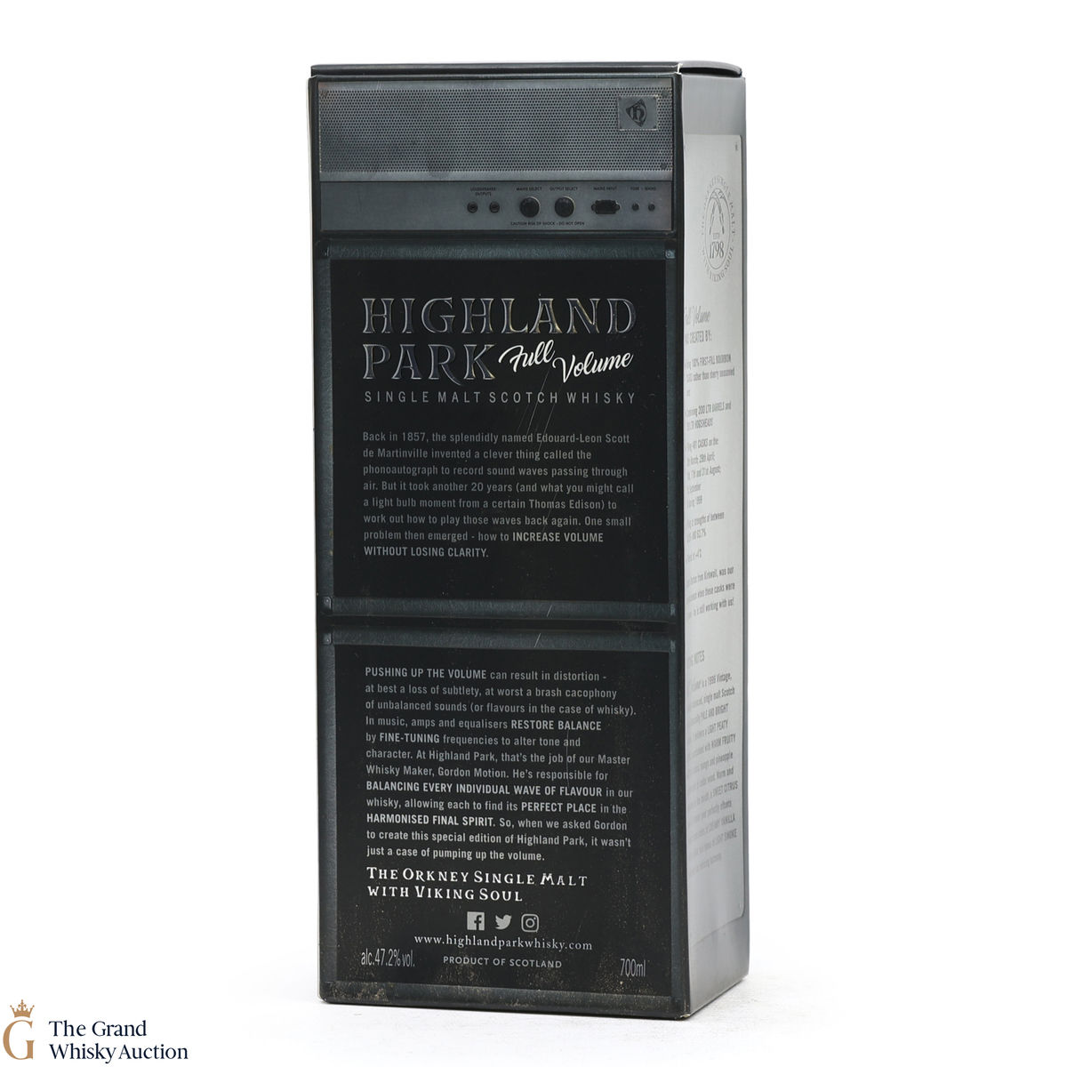 Full Volume by Highland Park was distilled in 1999 and bottled in 2017 from 481 casks. The single malt was matured exclusively in first-fill bourbon casks and was bottled at 47.2% ABV and comes presented in a themed presentation box resembling a speaker.