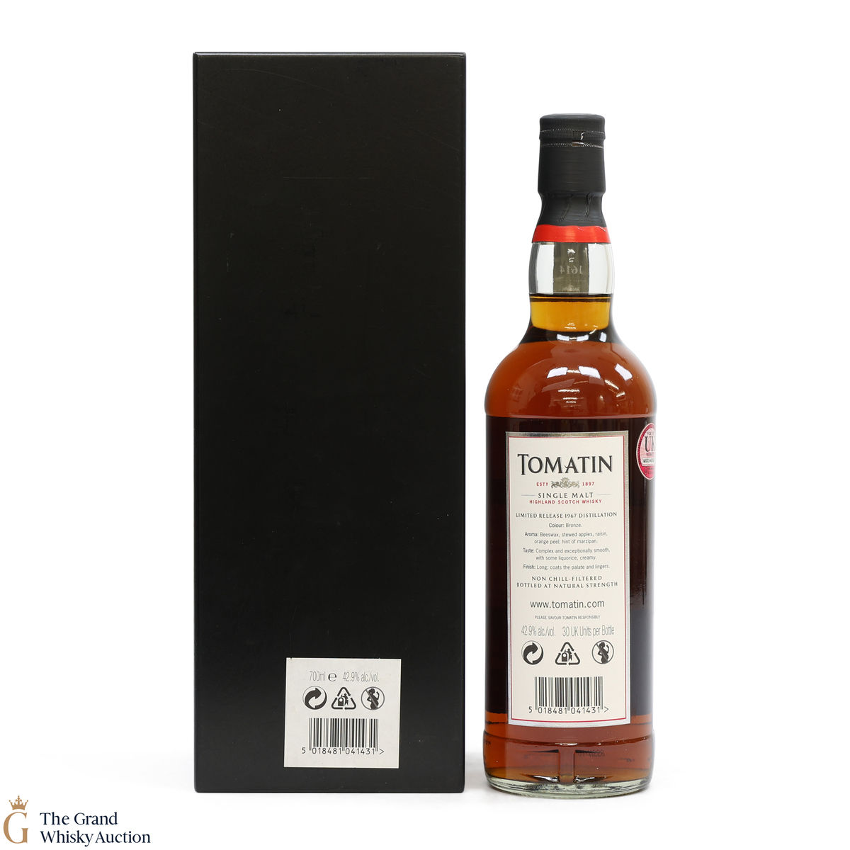 Due to the various ages of bottles and their seals, the condition of liquid is at the buyer's discretion and no claim can be lodged against failure/leakage in transit. Loss and breakage cover is available at 3% of the hammer price as standard. If the lot is not insured, no claim can be lodged against the courier or The Grand Whisky Auction for breakage or loss in transit.