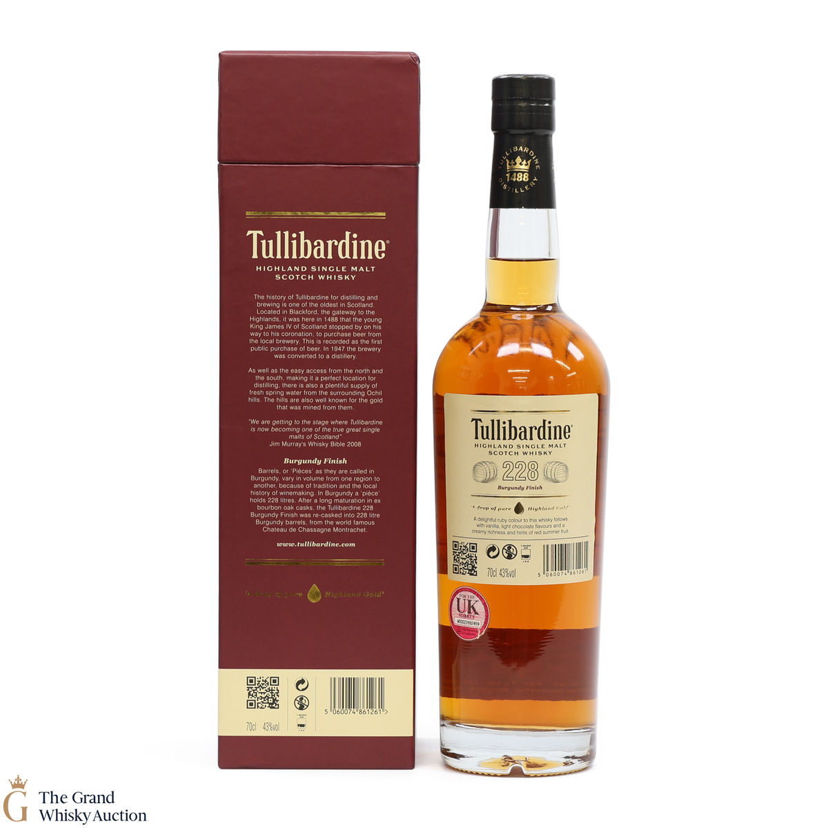 In Burgundy, a barrel holds 228 litres. After a lomg maturation in ex-bourbon oak casks, the Tullibardine 228 Burgundy Finish was re-casked into 228 litre barrels, from the world famous Chateau de Chassagne Montrachet.