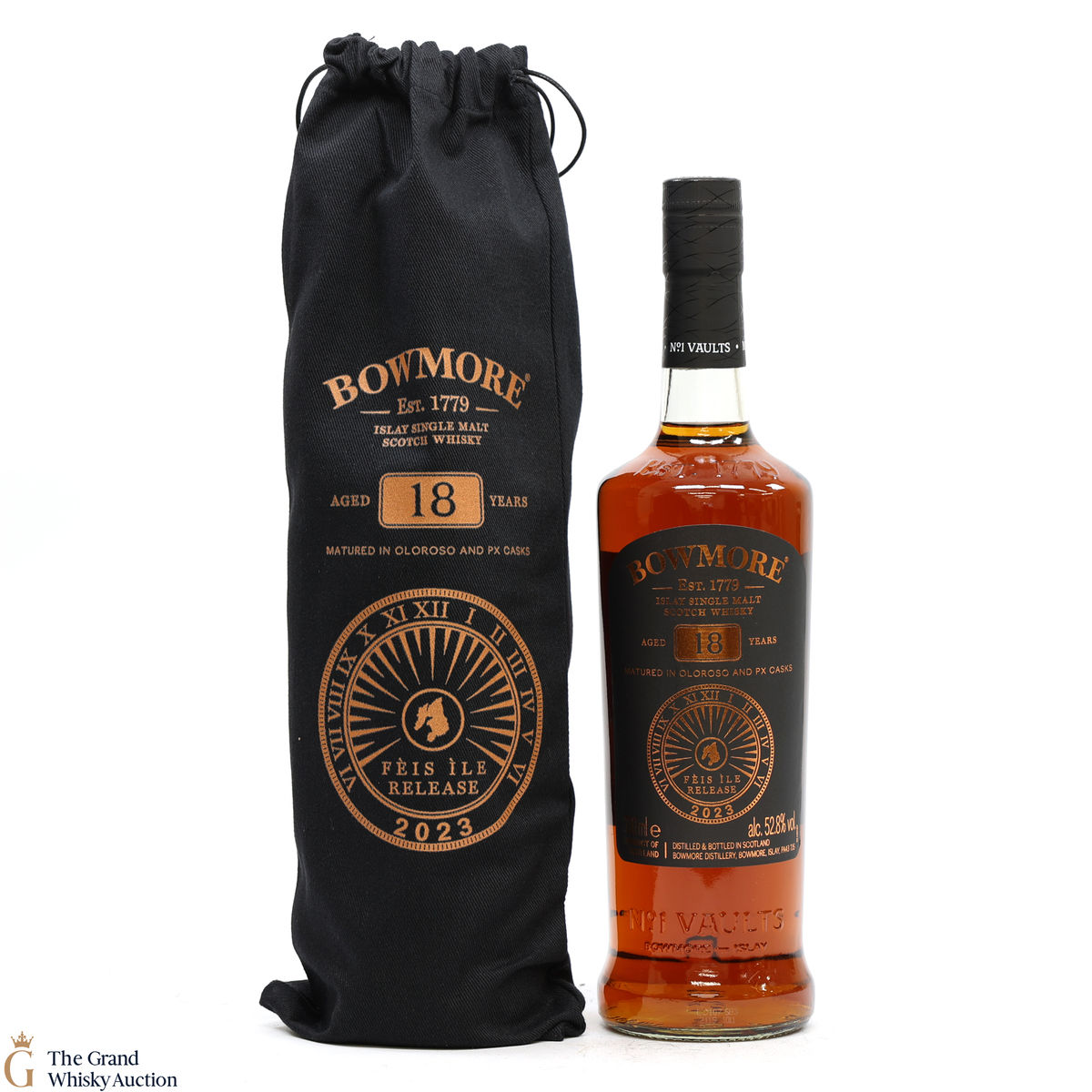 This is the Feis Ile 2023 release from Bowmore Distillery. Matured in Oloroso & PX casks for 18 years, this single malt was bottled at 52.8% ABV. This rare annual release from Bowmore is limited to just 3500 bottles.