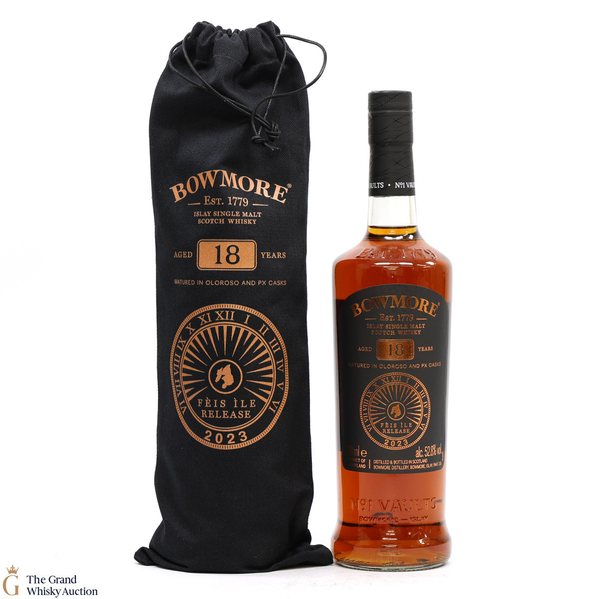 This is the Feis Ile 2023 release from Bowmore Distillery. Matured in Oloroso & PX casks for 18 years, this single malt was bottled at 52.8% ABV. This rare annual release from Bowmore is limited to just 3500 bottles.