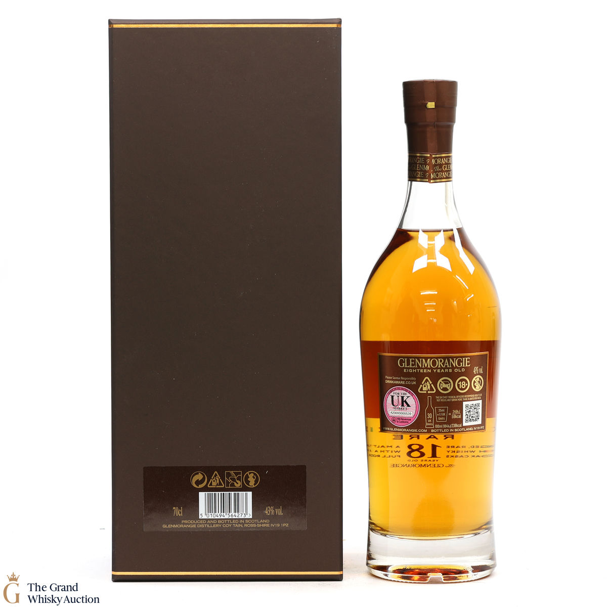 This bottle is an 18-year-old Extremely Rare, Highland single malt produced by Glenmorangie. It has been perfected by the sixteen men of Tain who have specially aged this bottle for 18 years in superior oak casks.