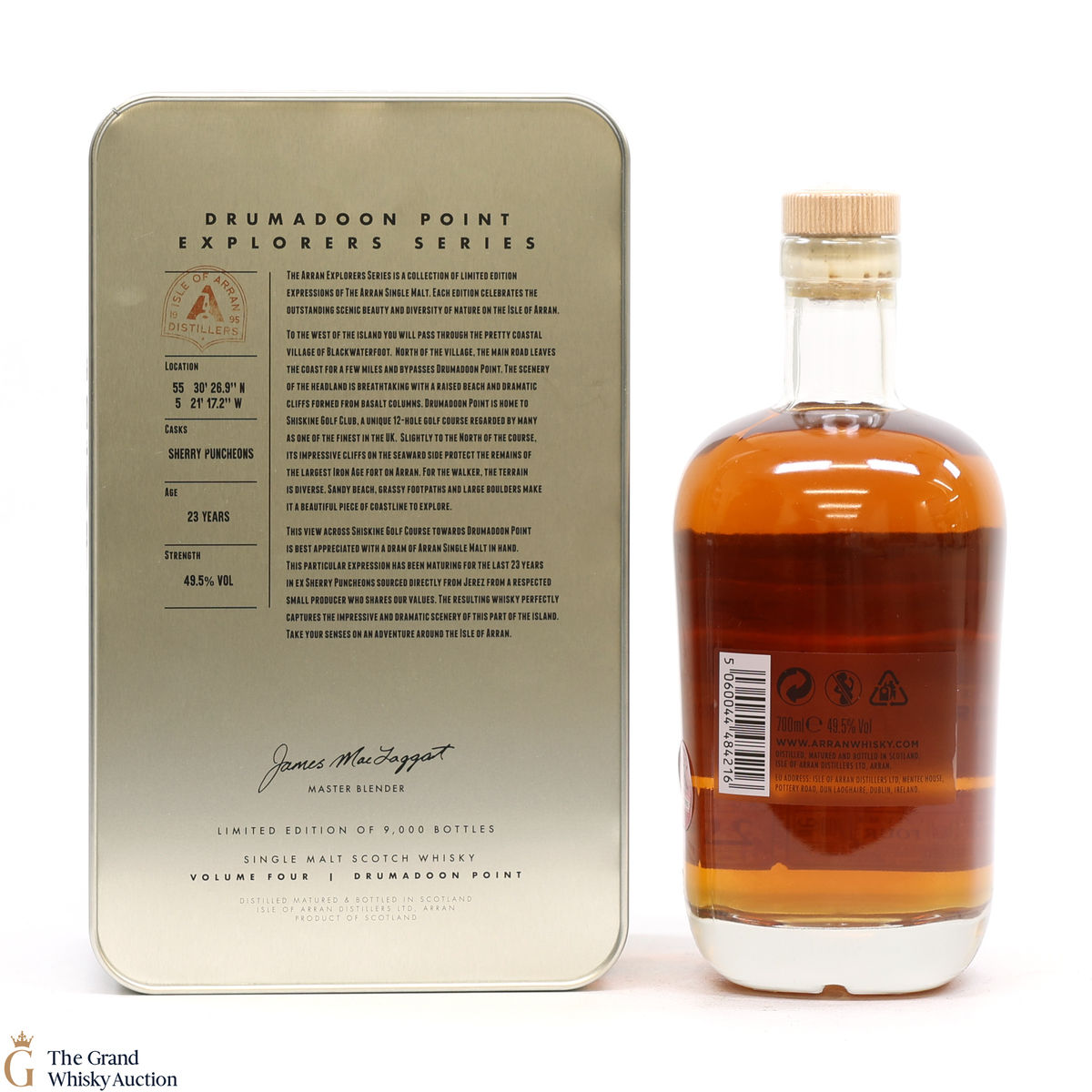 The presentation tin and the bottle label features beautiful views of Drumadoon point.