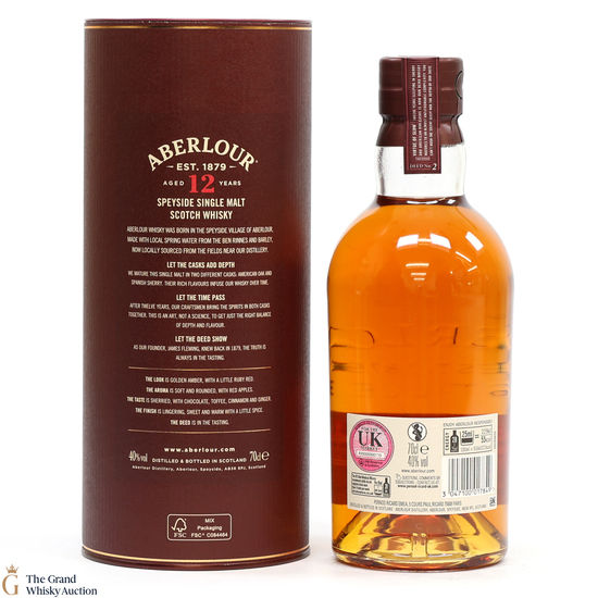 This Aberlour 12 Year Old, has been double cask matured in two handmade oak cask types. The double maturation both traditional oak and sherry casks adds depth of character to this single malt, now bottled at 40% abv.