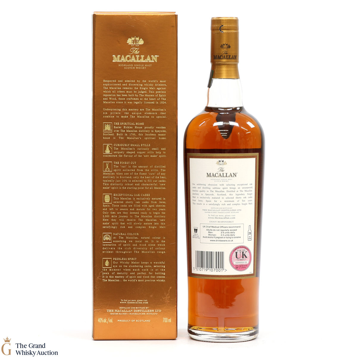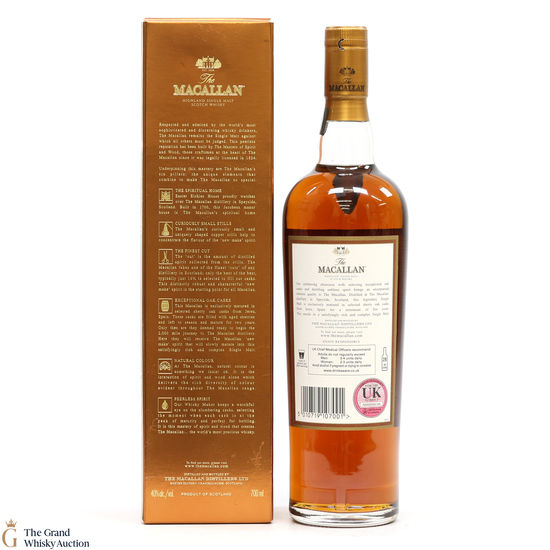 Distilled at the world-renowned Macallan Distillery in Speyside, this single malt was matured exclusively in sherry oak casks from Jerez, Spain. It was aged for a total of 10 years prior to bottling at a strength of 40% ABV.