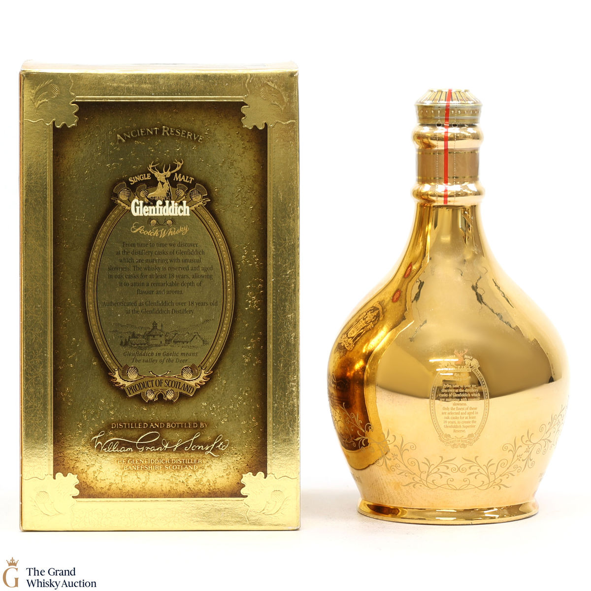 This beautiful golden decanter was produced by Spode and crafted with 23-carat gold gilded ceramic and filigree highlights. Filled with 18 Year Old Glenfiddich single malt.