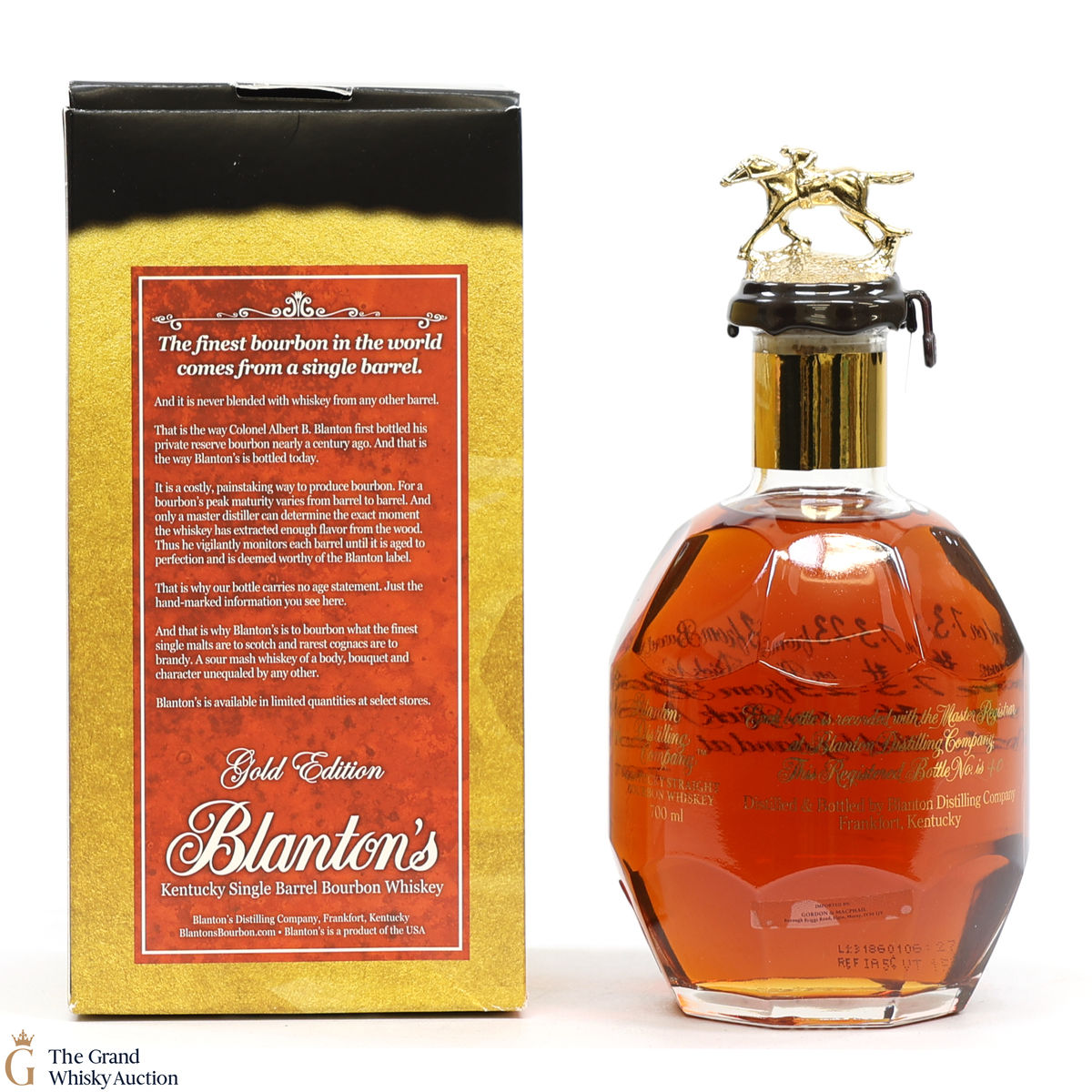 PLEASE NOTE: The wax seal on Blanton's bottles are prone to cracking in transit due to their design. Therefore, as stated in our T&C’s, we do not and will not accept liability should the seal be breached, broken, split or leak in transit. Additionally, please know due to the design of the internal cardboard packaging that surrounds the top of the bottles, it too may be torn. By bidding on this lot you have understood this to be true. Insurance is for complete breakage or loss in transit only.