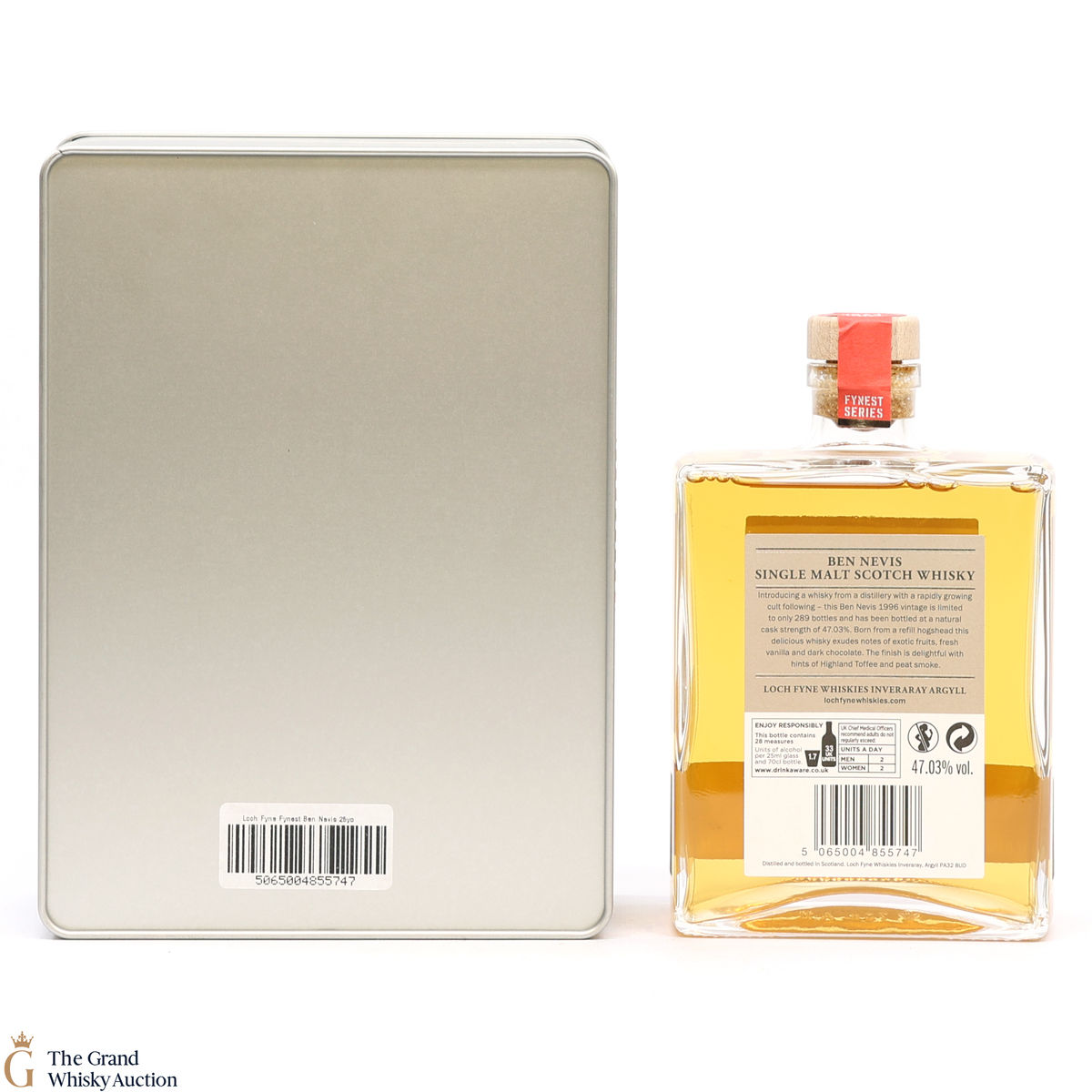 This bottling is part of Ben Nevis's Single Cask Series and was bottled exclusively for Loch Fyne Whiskies. Distilled in October 1996, this single malt was matured for 25 years in refill hogshead #1402 at the cask strength of 47.03% ABV. With only 289 bottles available, this is a limited edition.