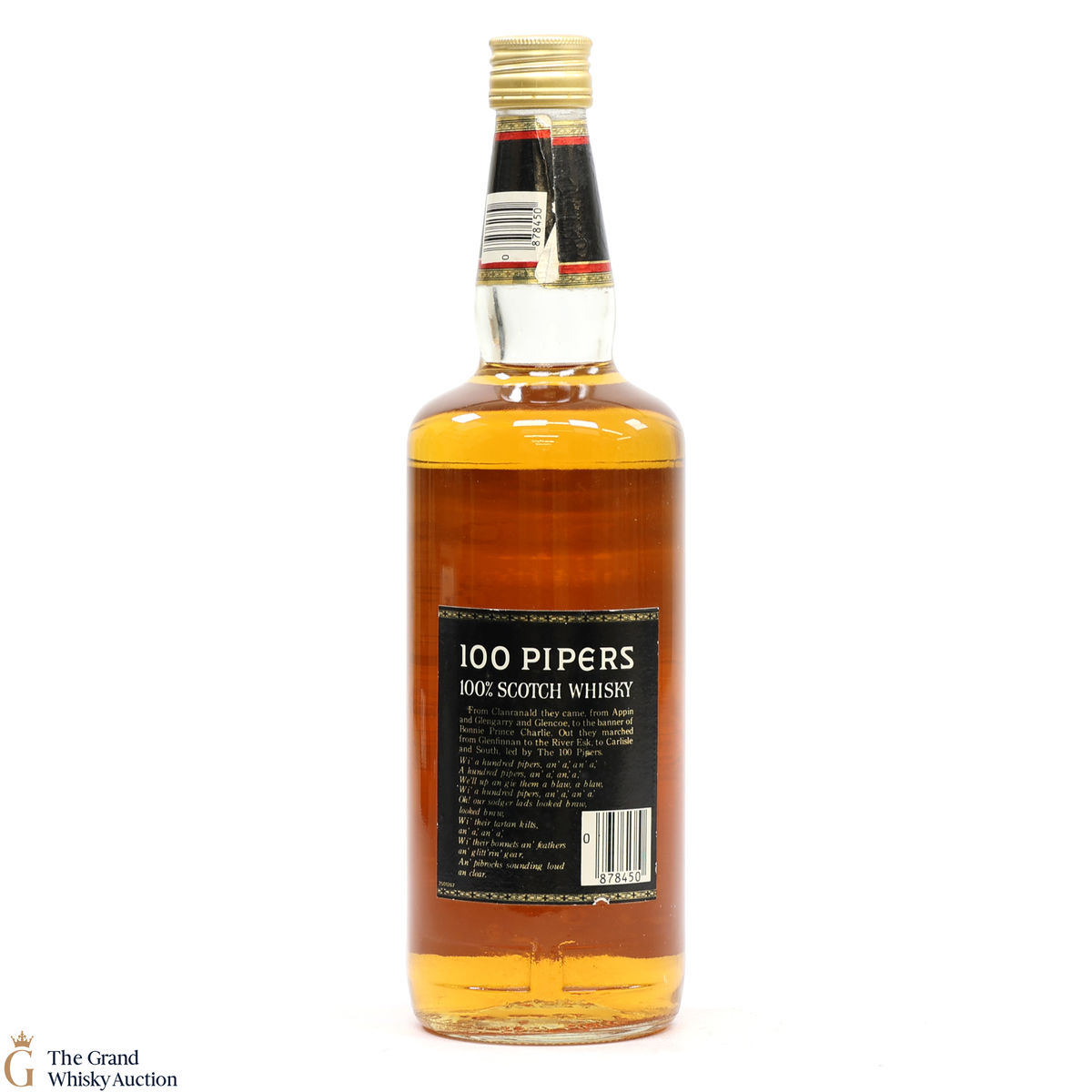 A 75cl bottling of Seagram's 100 Pipers Deluxe blended Scotch whisky, which was named after the 100 pipers that followed Bonnie Prince Charlie into battle.