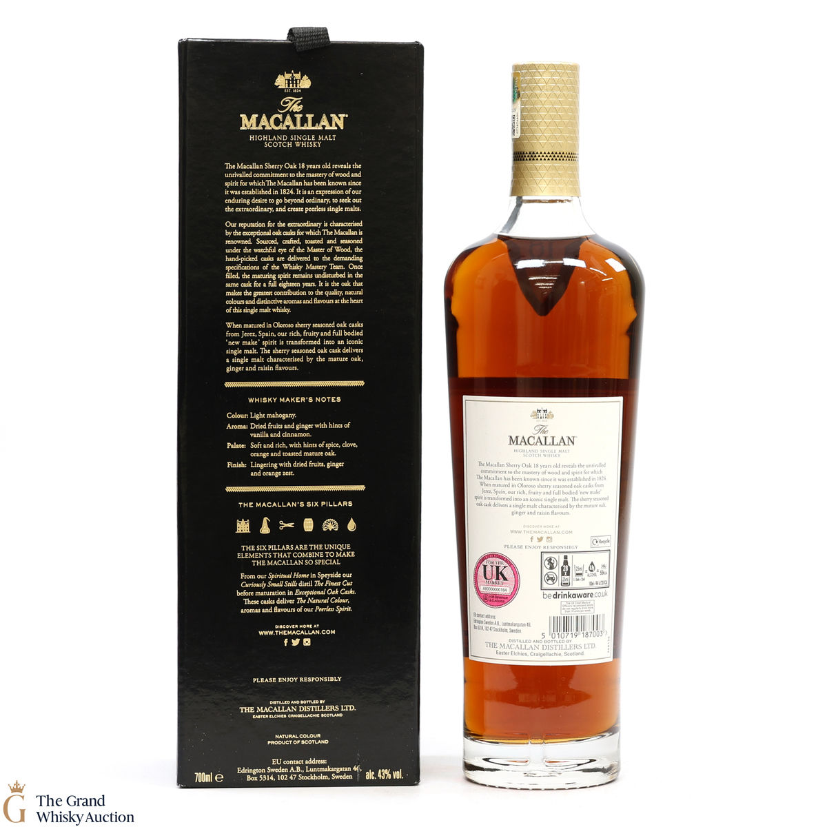This annual release of The Macallan's popular 18 Year Old Sherry Oak is matured exclusively in sherry seasoned casks, built from both Spanish and American oak, providing a beautifully dark flavour with rich aromas.