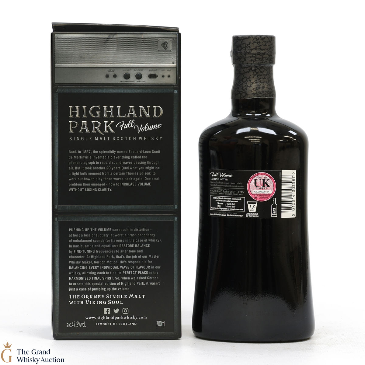 Full Volume by Highland Park was distilled in 1999 and bottled in 2017 from 481 casks. The single malt was matured exclusively in first-fill bourbon casks and was bottled at 47.2% ABV and comes presented in a themed presentation box resembling a speaker.
